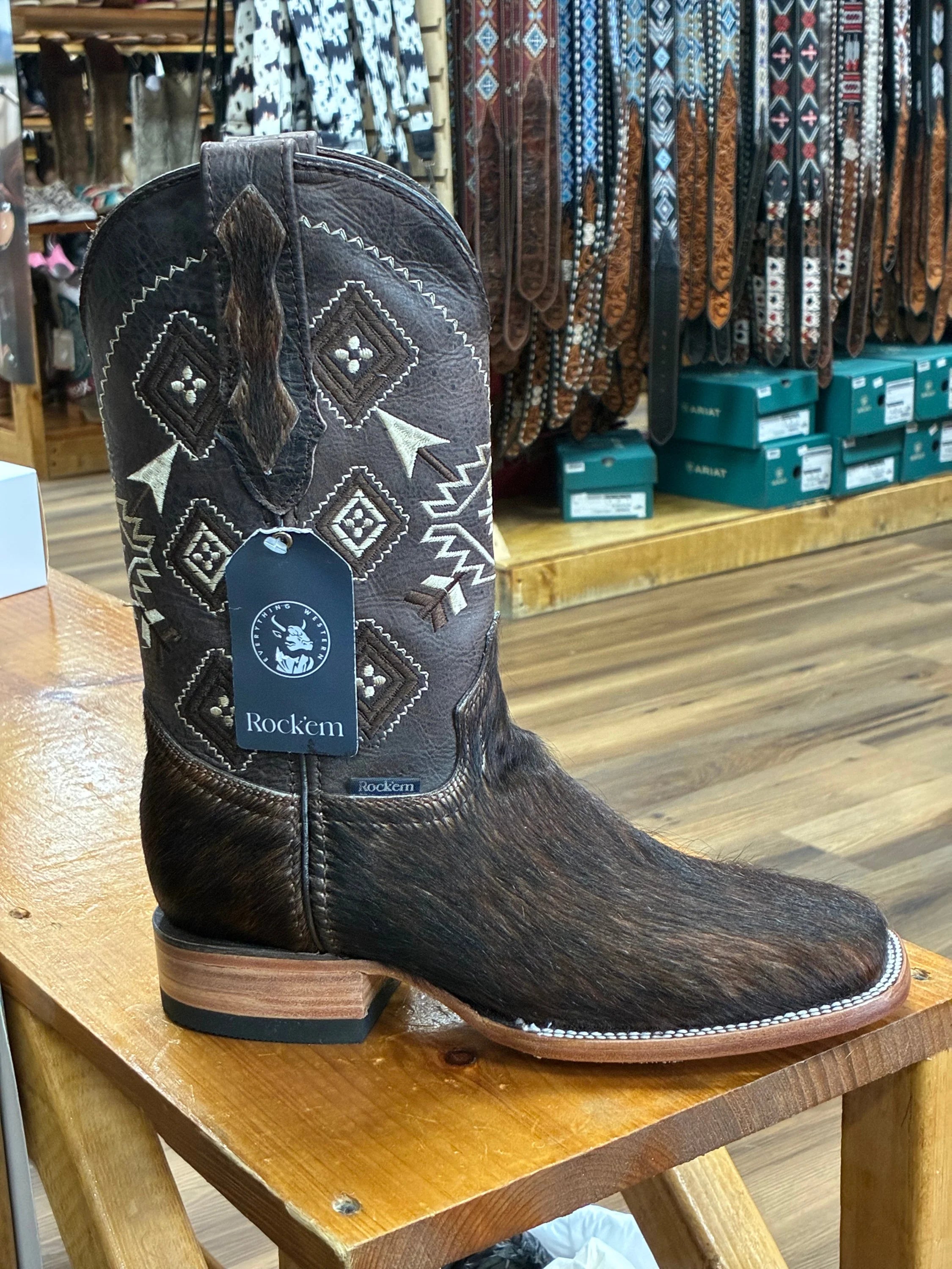 ROCKEM COWHIDE BROWN AND WHITE SQ. TOE BOOT (EVERY PAIR IS UNIQUE)