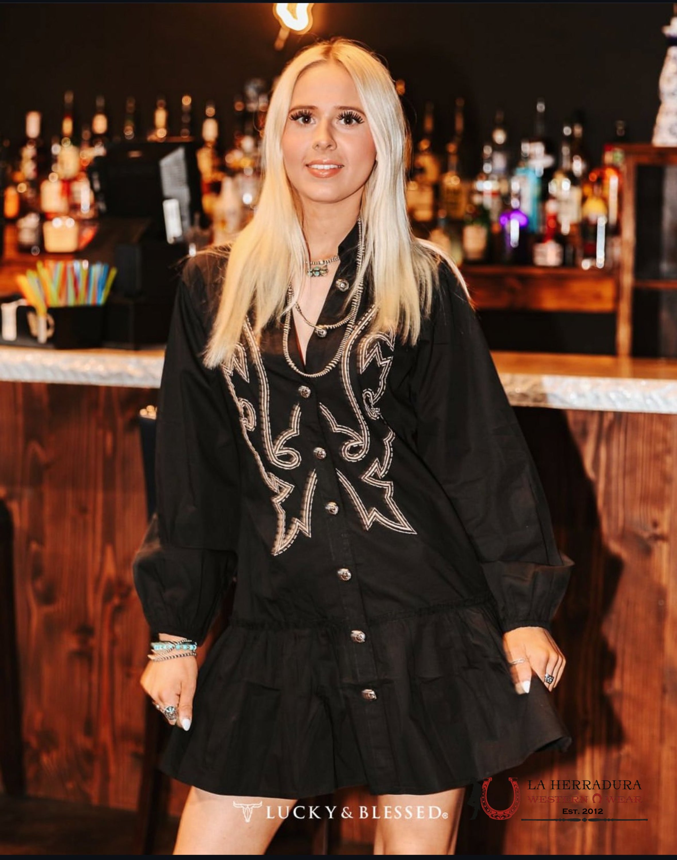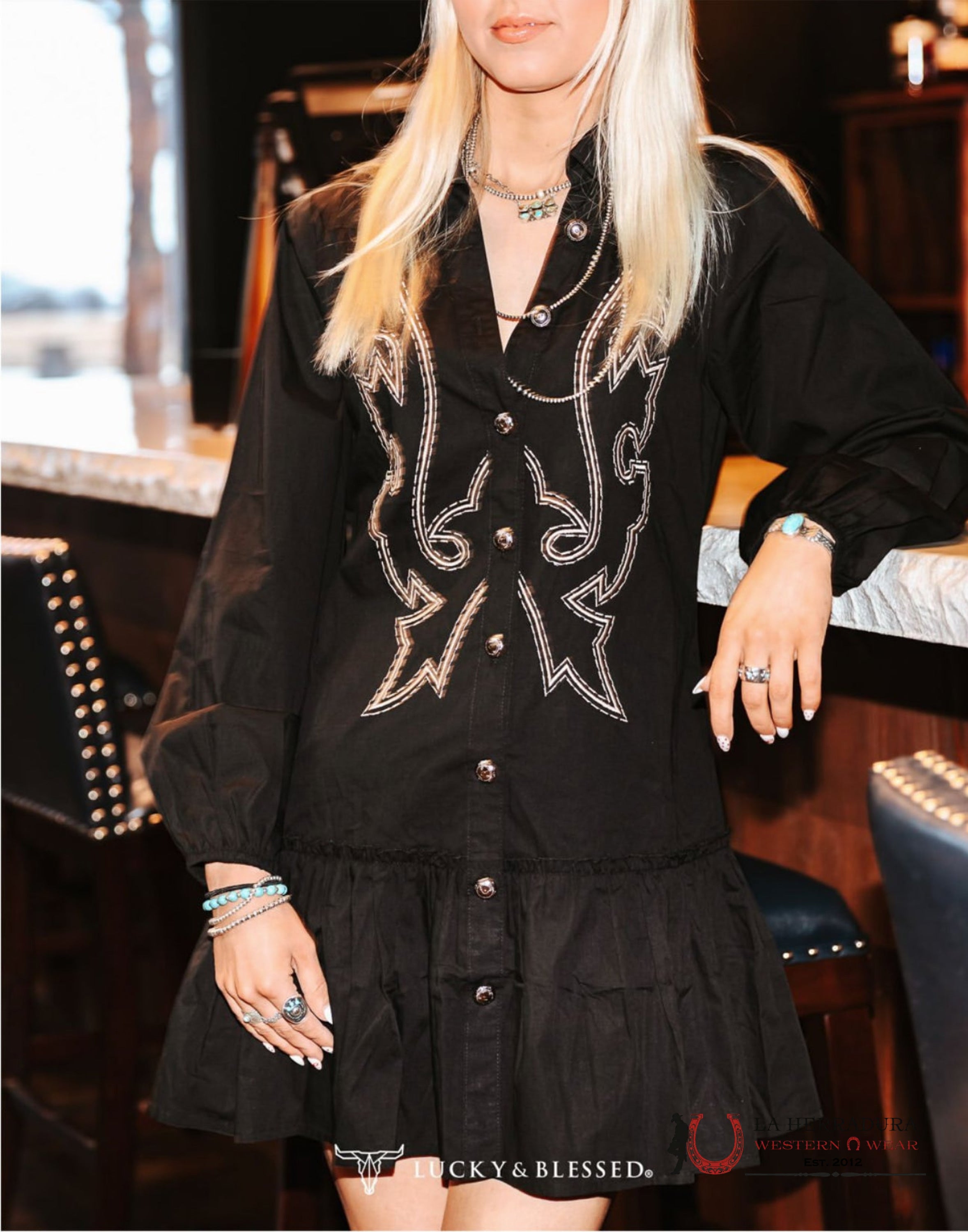 LUCKY WOMAN AND BLESSED BLACK LONG SLEEVE WITH COWBOY PRINT DRESS
