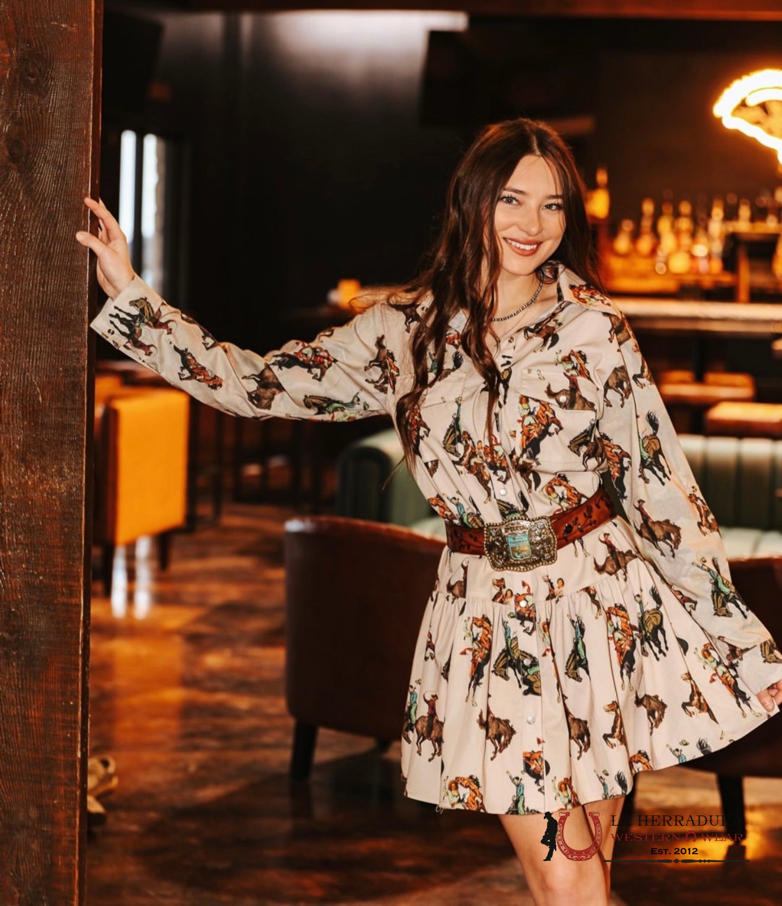 LUCKY WOMAN AND BLESSED BROWN LONG SLEEVE WITH COWBOY PRINT DRESS
