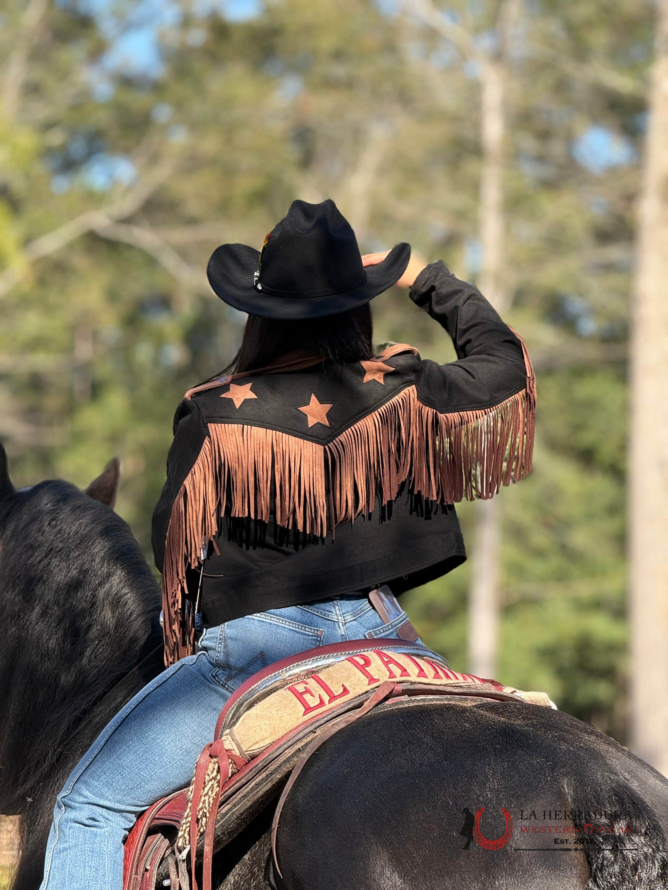 Rock&roll Womens Micro Suede Jacket W Fringe Black/Brown Stars BW92D04927