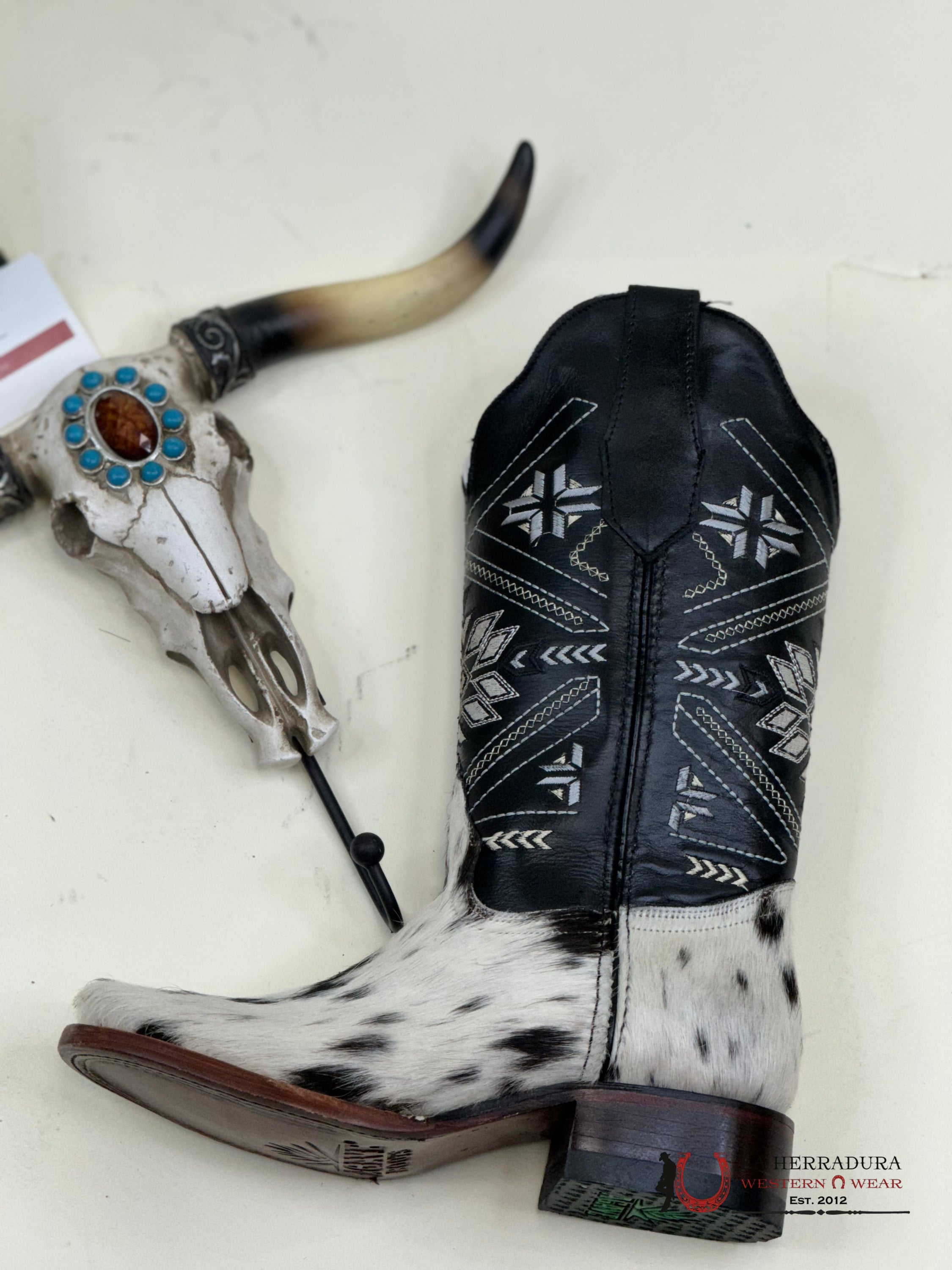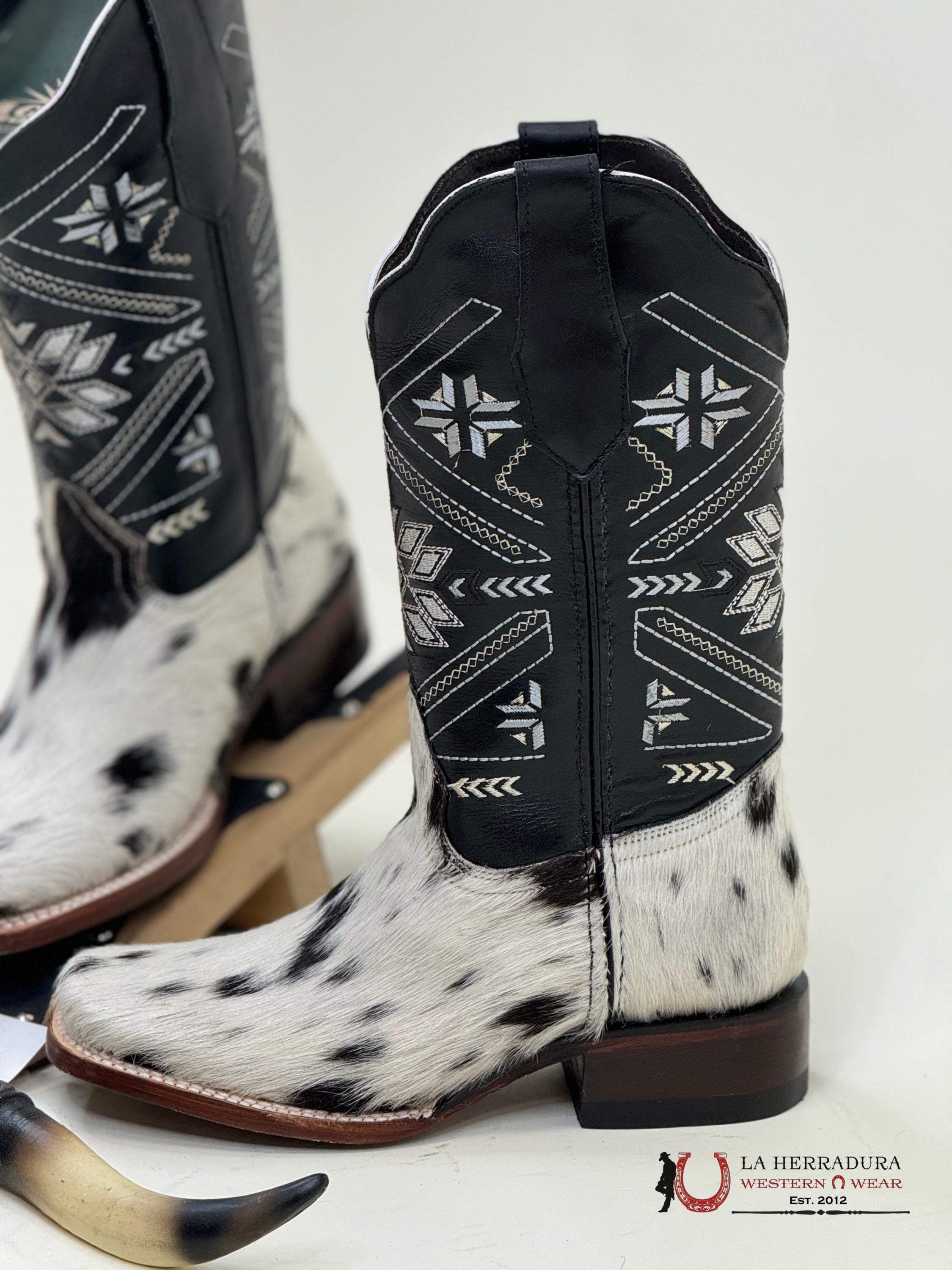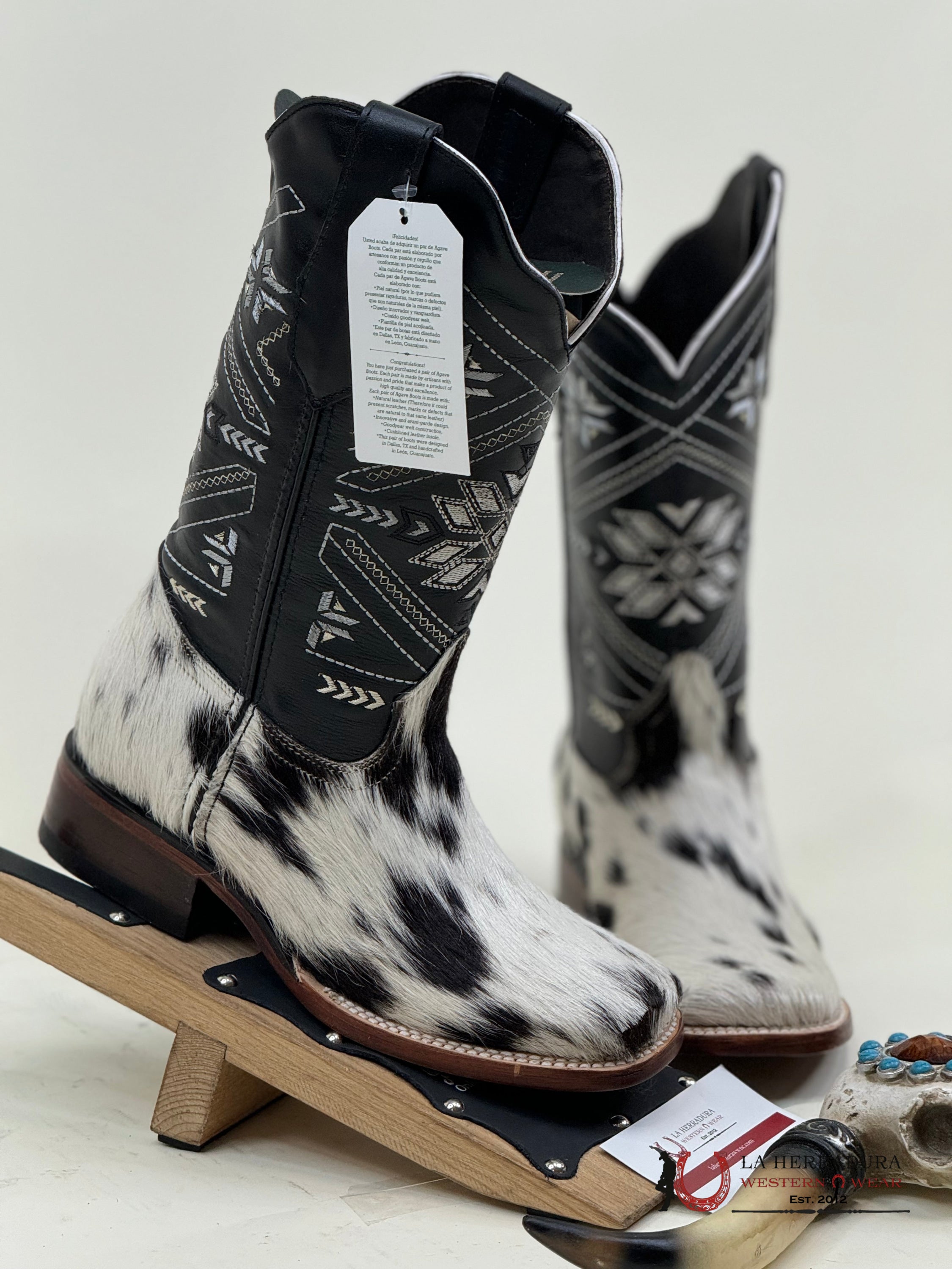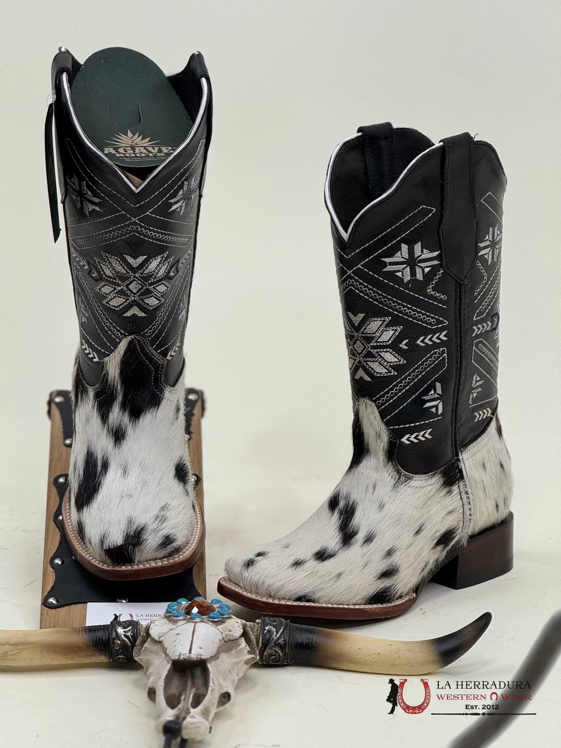 Experience the one-of-a-kind style of our Agave BLACK WOMENS & WHITE COW HIDE boots. Each pair is crafted from luxurious, exotico cow hide, making them truly unique. Elevate your wardrobe with these statement boots that are sure to turn heads.