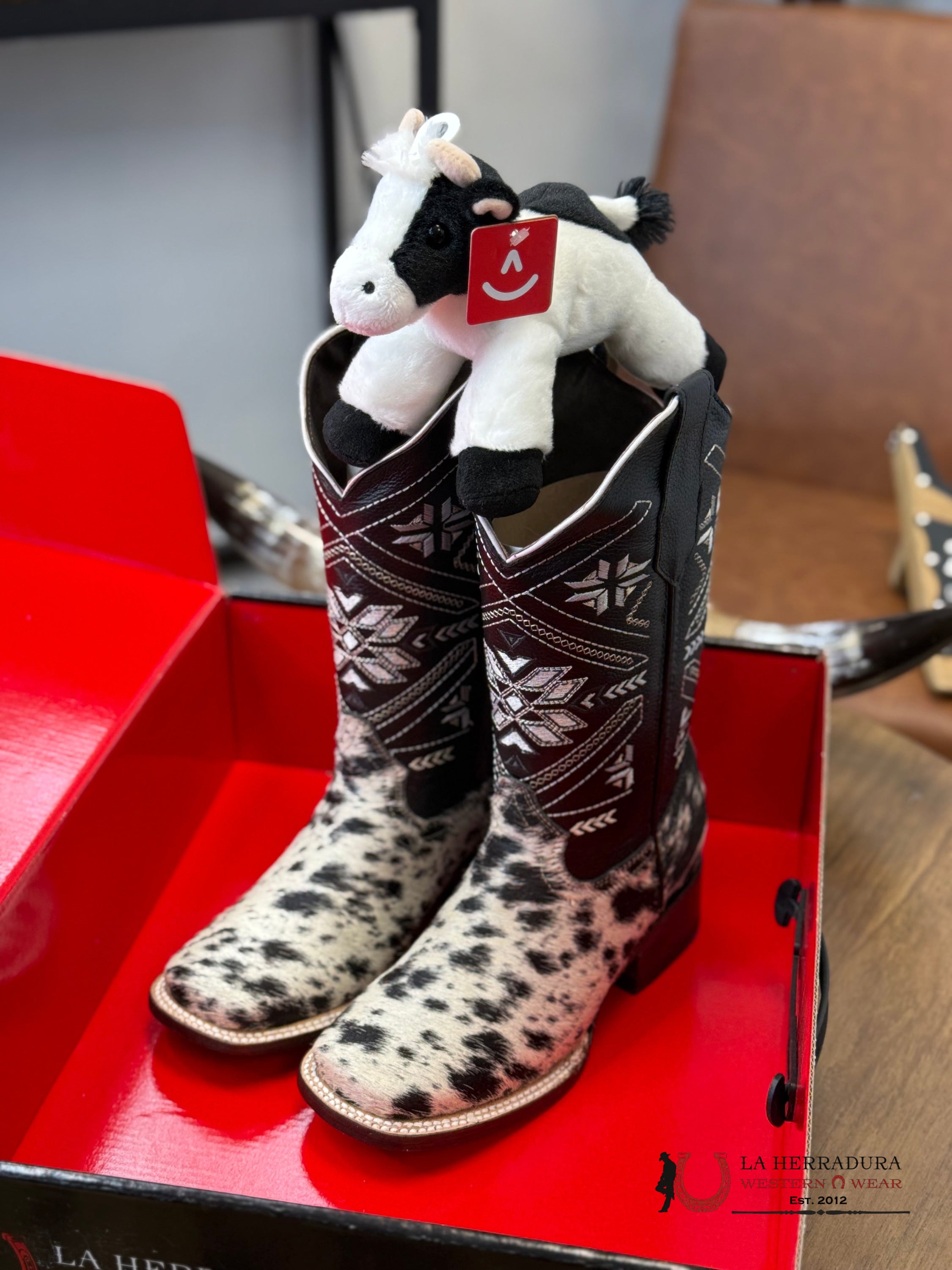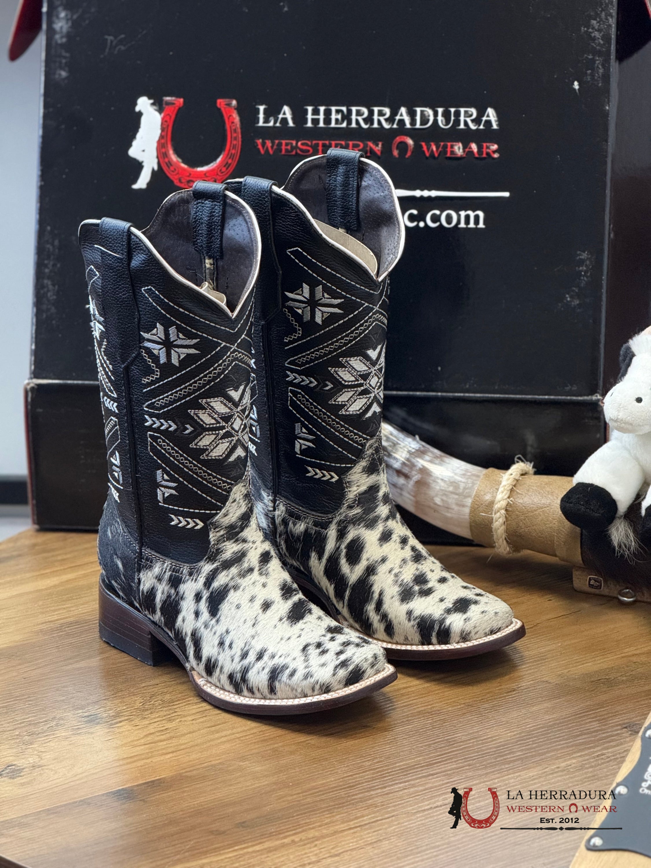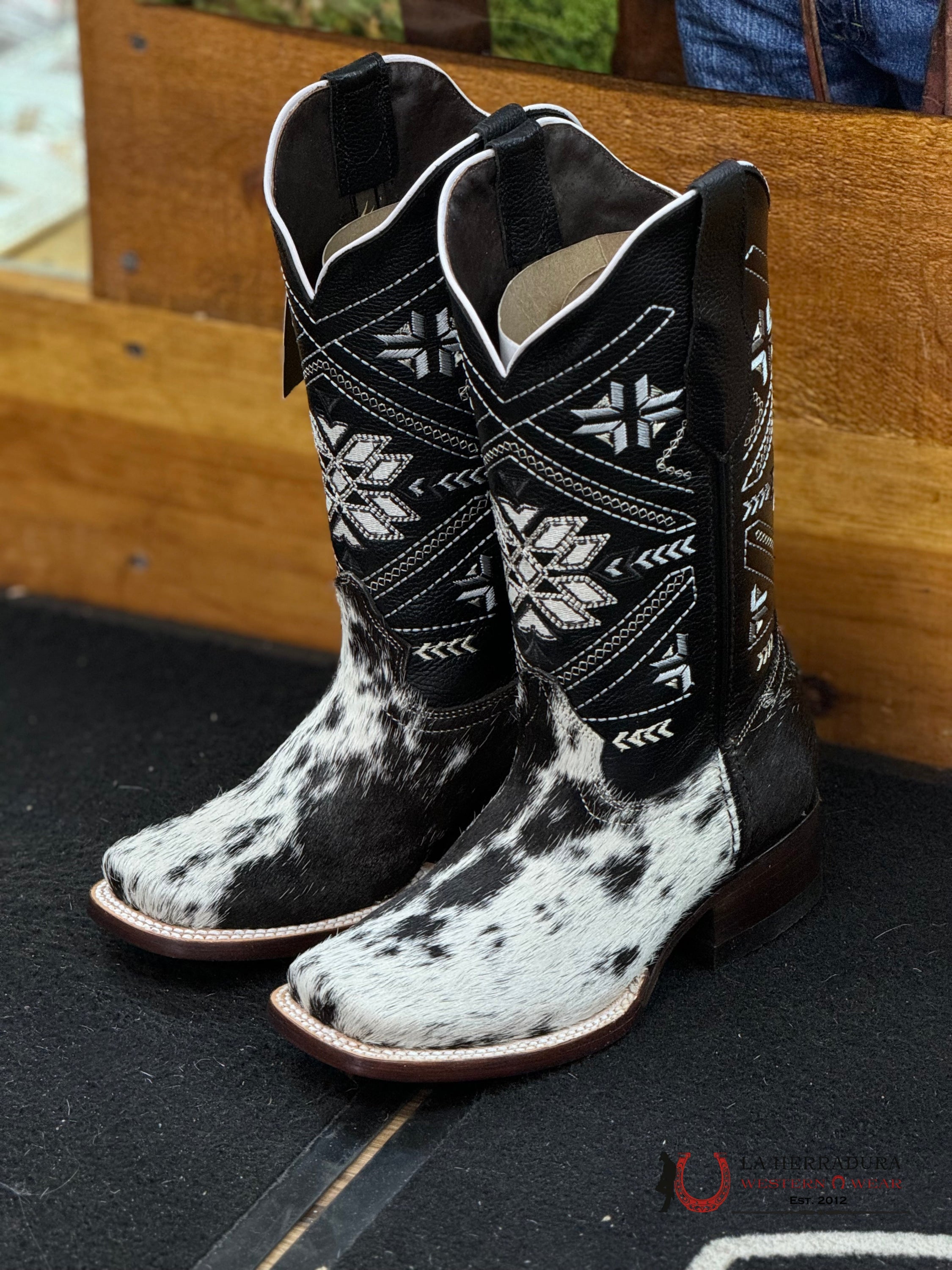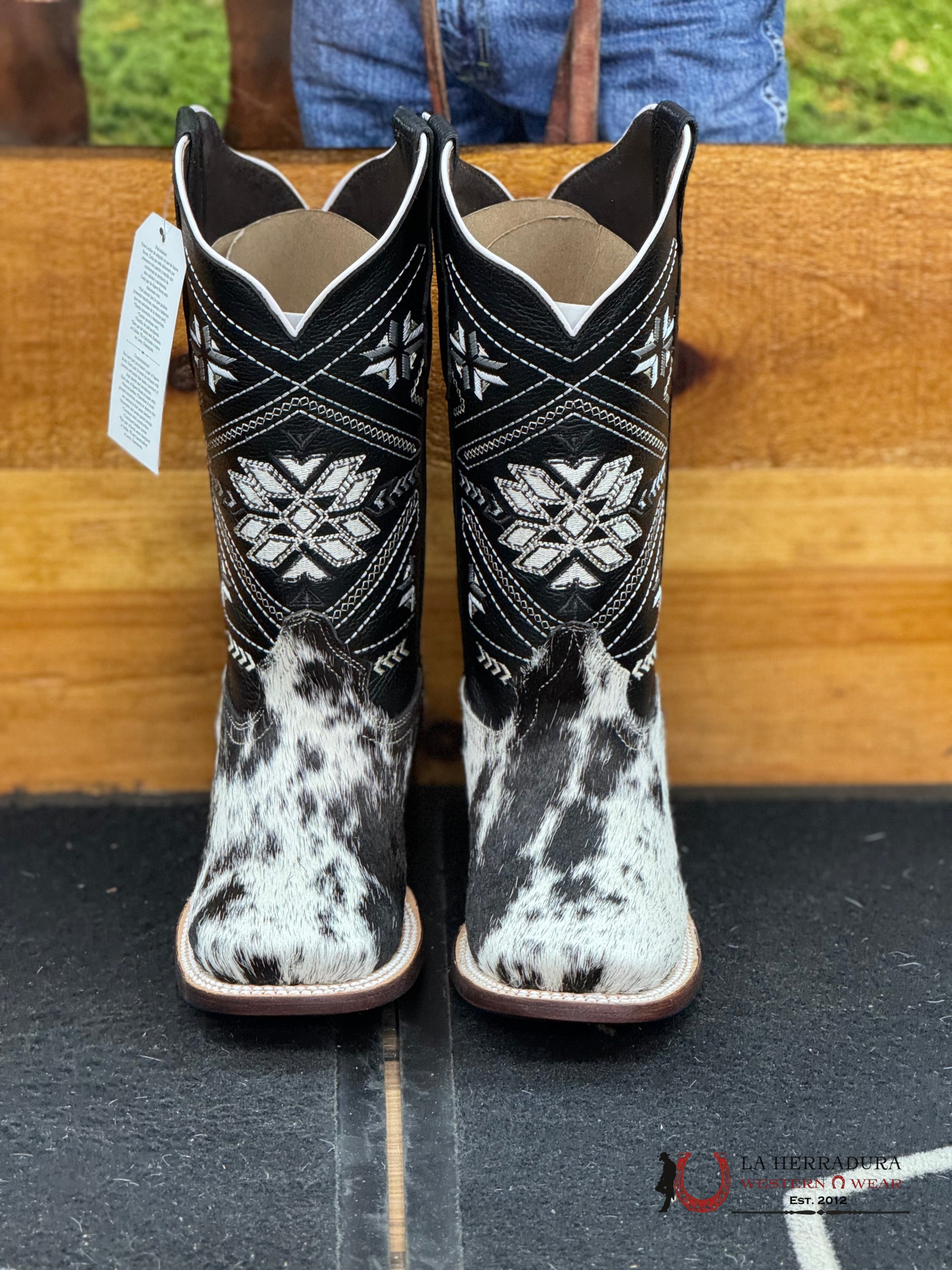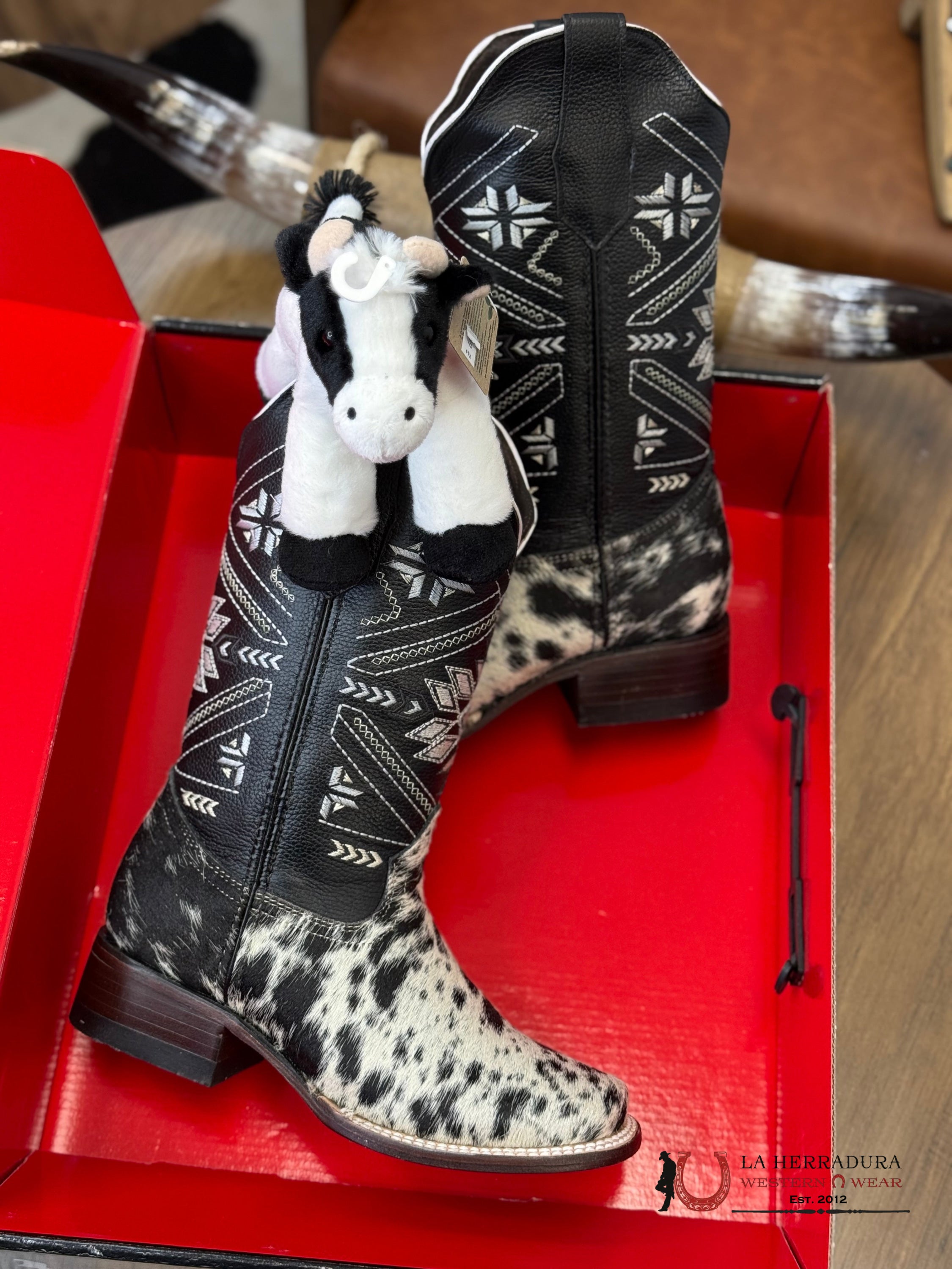 Experience the one-of-a-kind style of our Agave BLACK WOMENS & WHITE COW HIDE boots. Each pair is crafted from luxurious, exotico cow hide, making them truly unique. Elevate your wardrobe with these statement boots that are sure to turn heads.