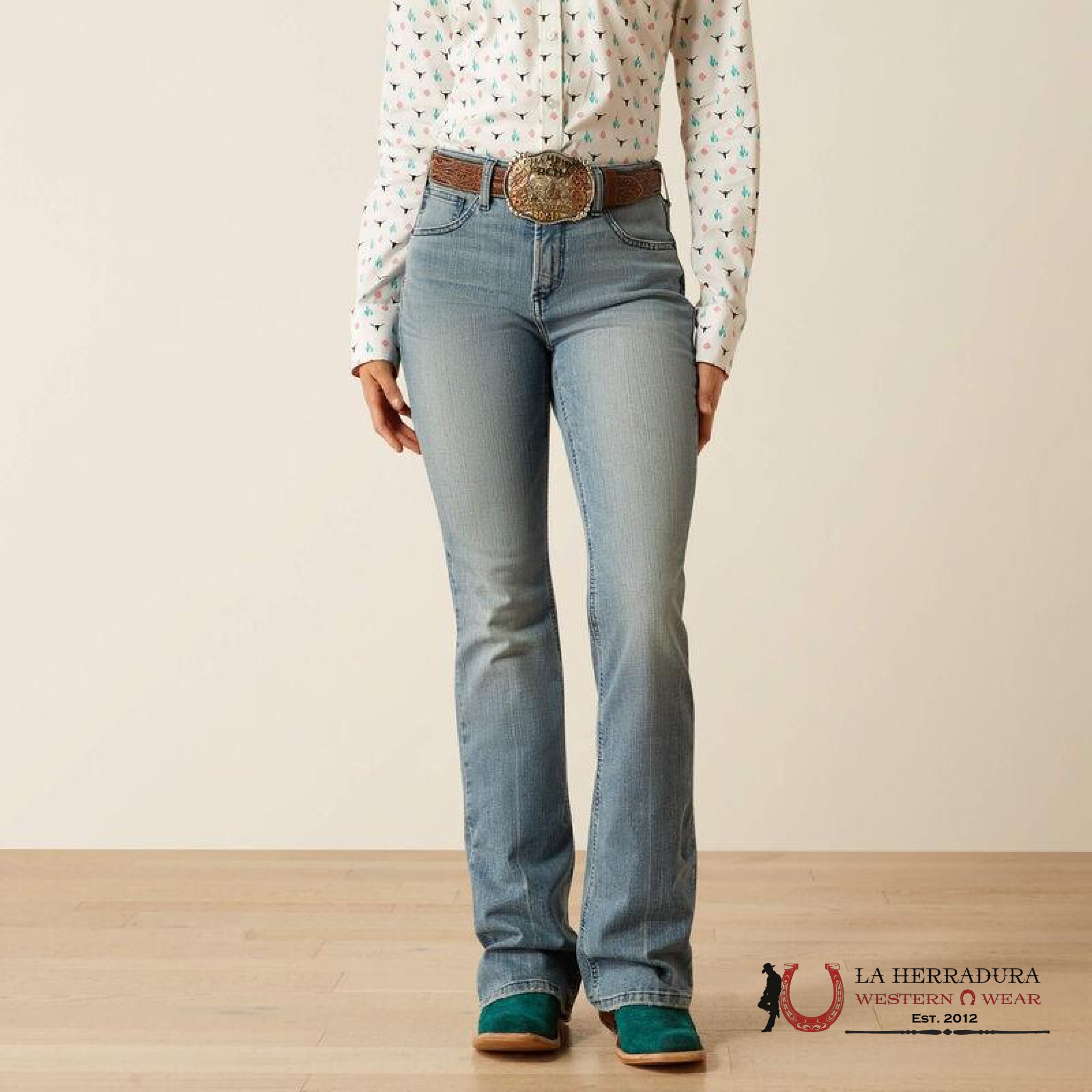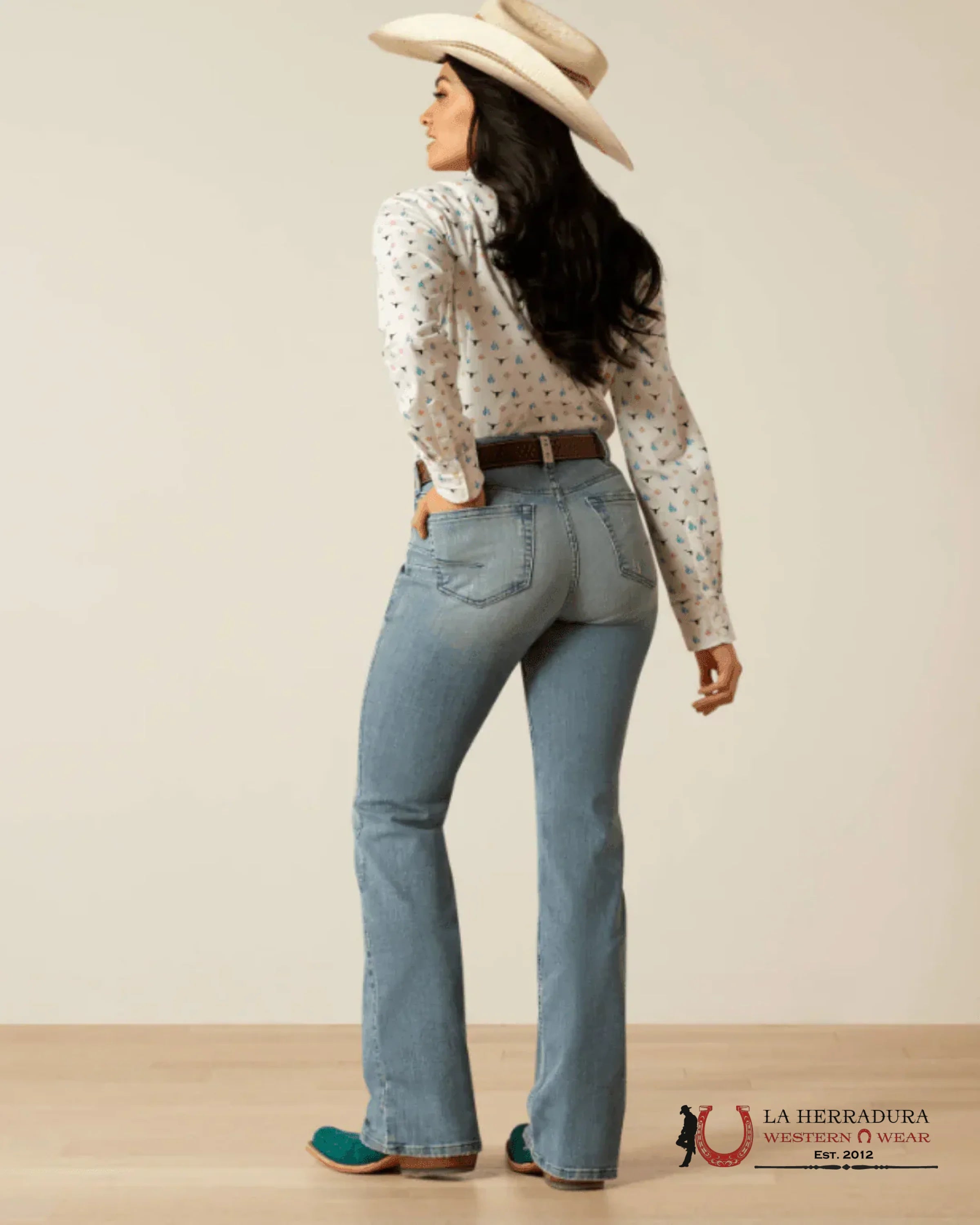 Elevate your western style with the ARIAT WOMENS JEAN SABINE HIGH RISE BOOTCUT. The unique, light wash adds a touch of flair to the classic boot cut and high rise fit. Perfect for any cowgirl looking to make a statement and stand out in a crowd. Don't miss out on this one-of-a-kind piece!