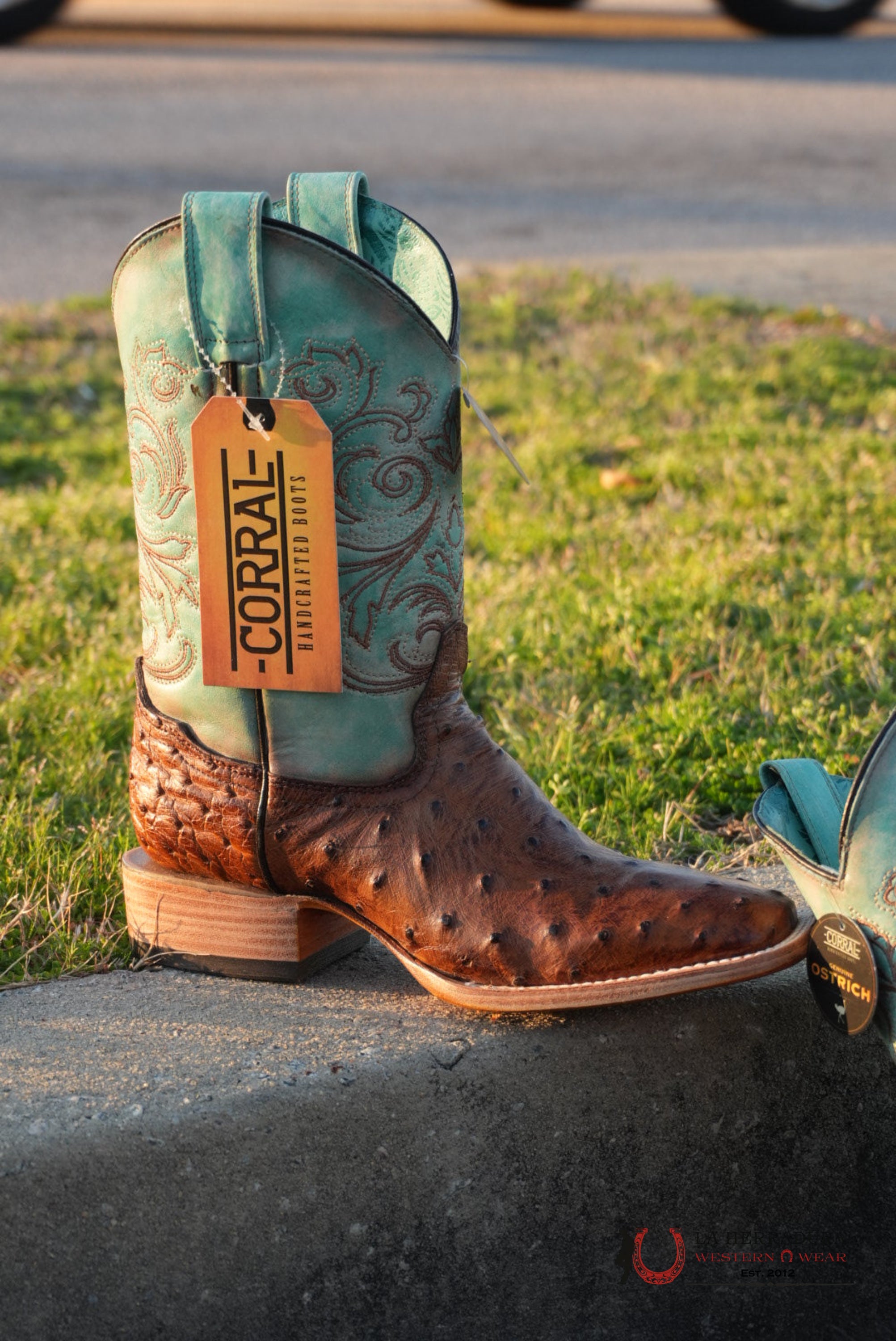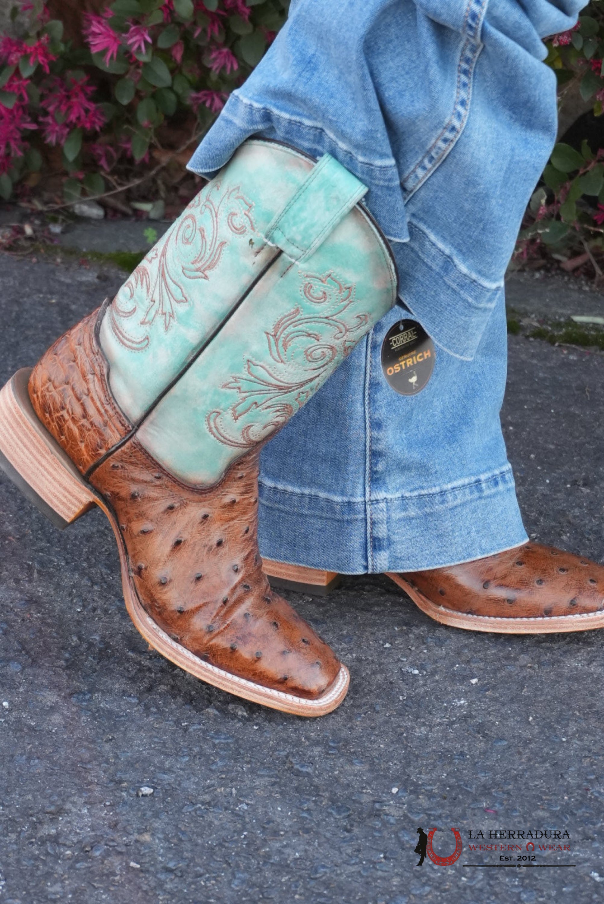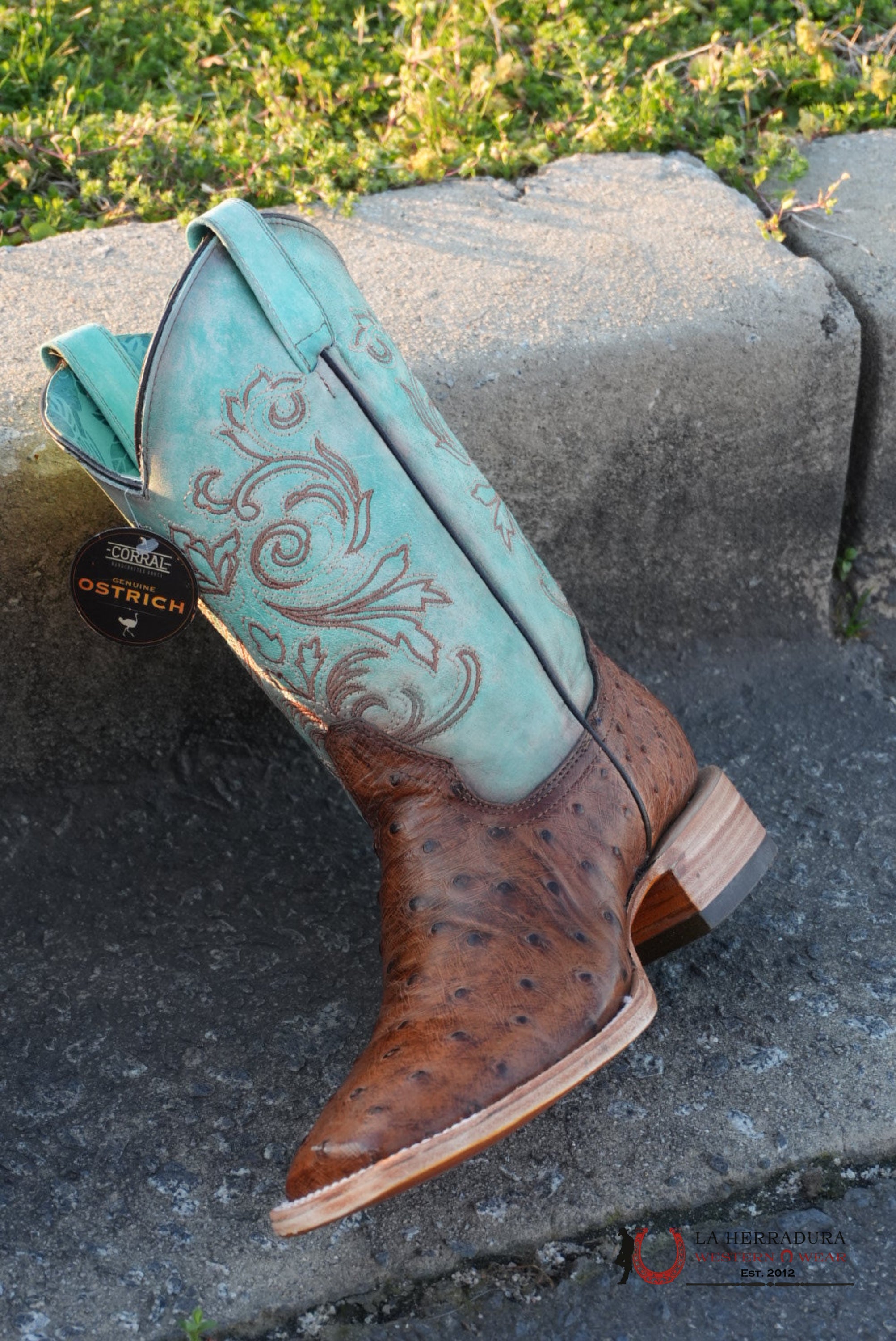 Step out in style with our CORRAL HONEY DISTRESSED BLUE OSTRICH EMBROIDERED boots! Made with real, genuine ostrich skin for an exotic and elegant touch. The distressed blue top adds a unique touch, while the square toe and sturdy build make these boots perfect for any woman looking to make a statement.