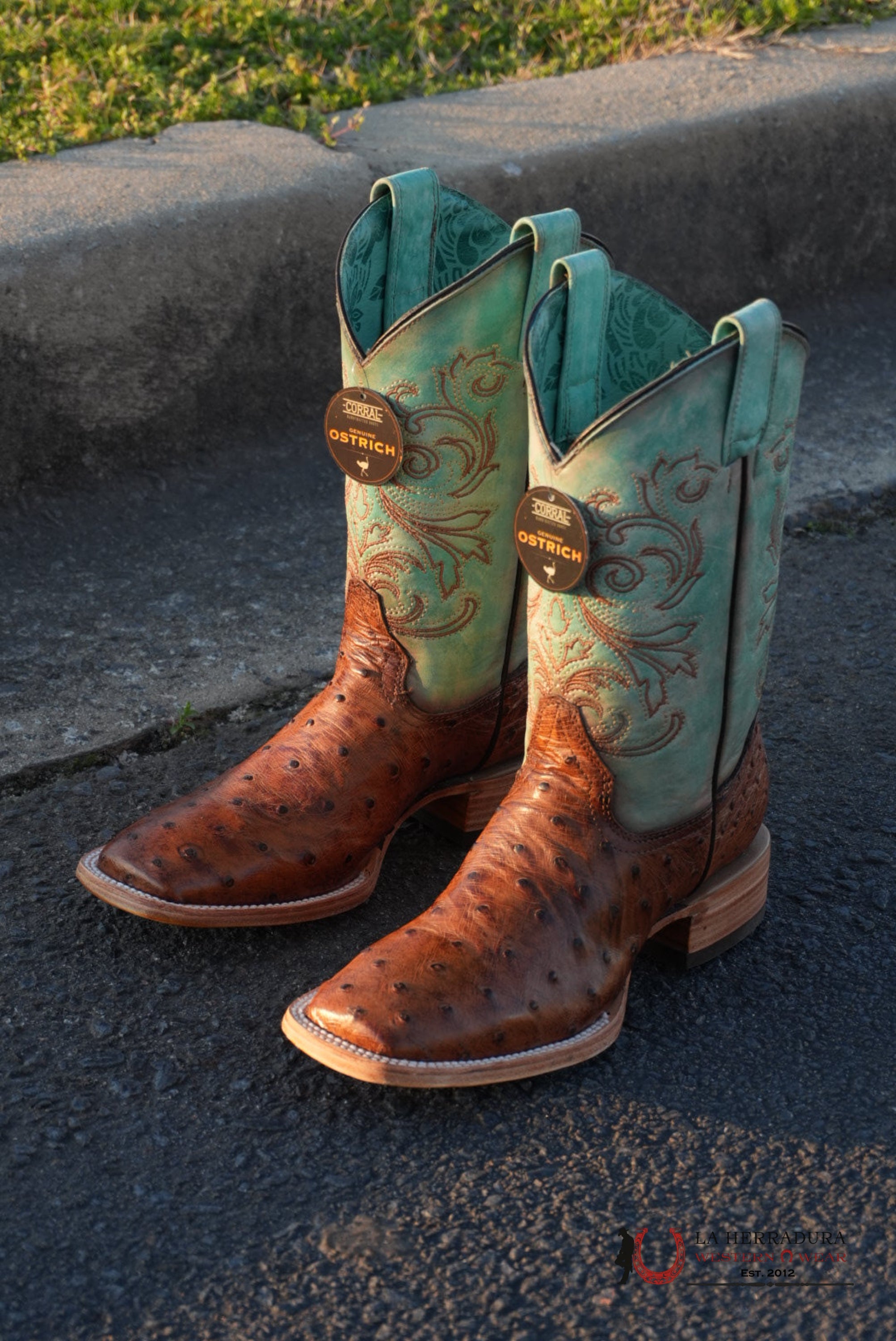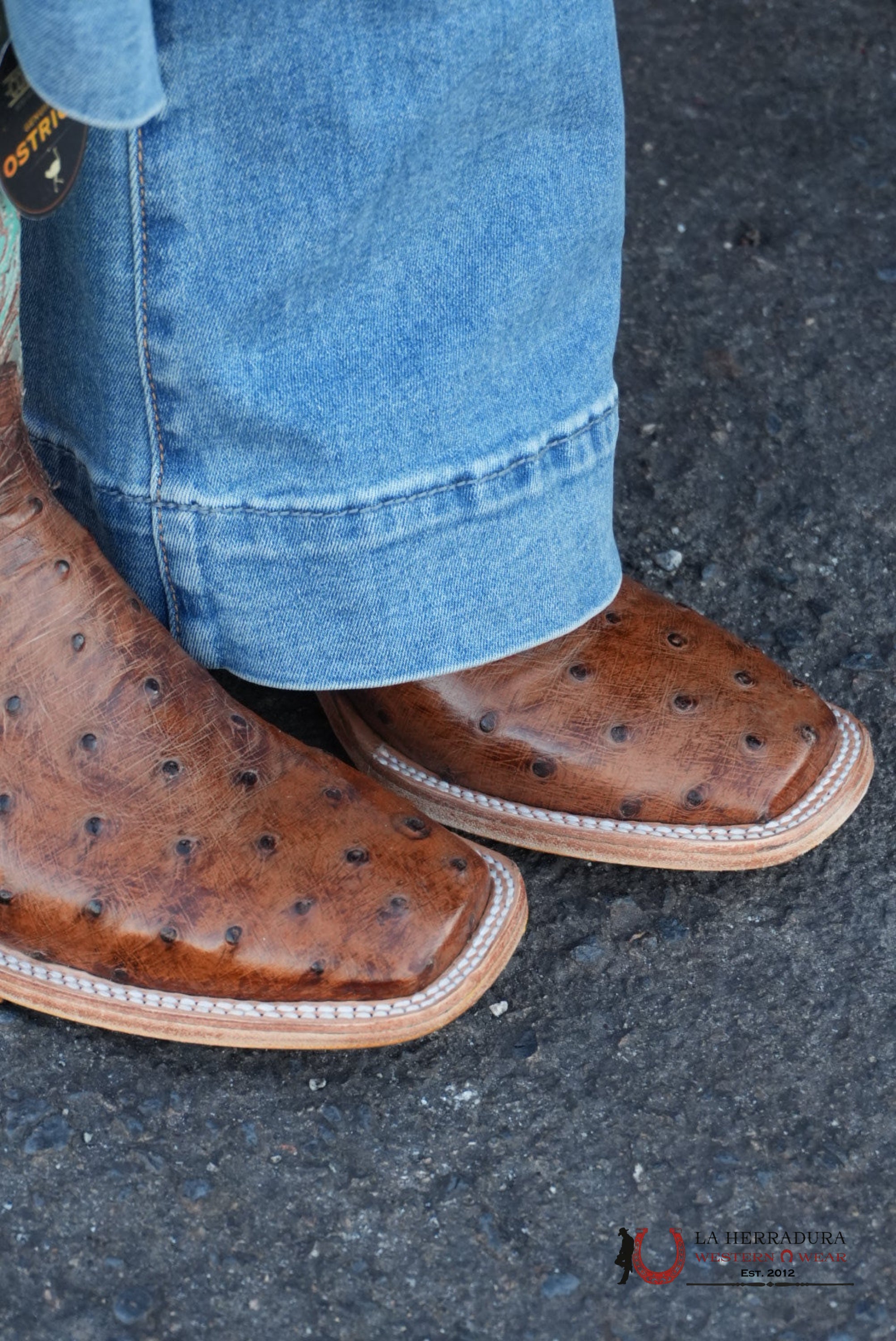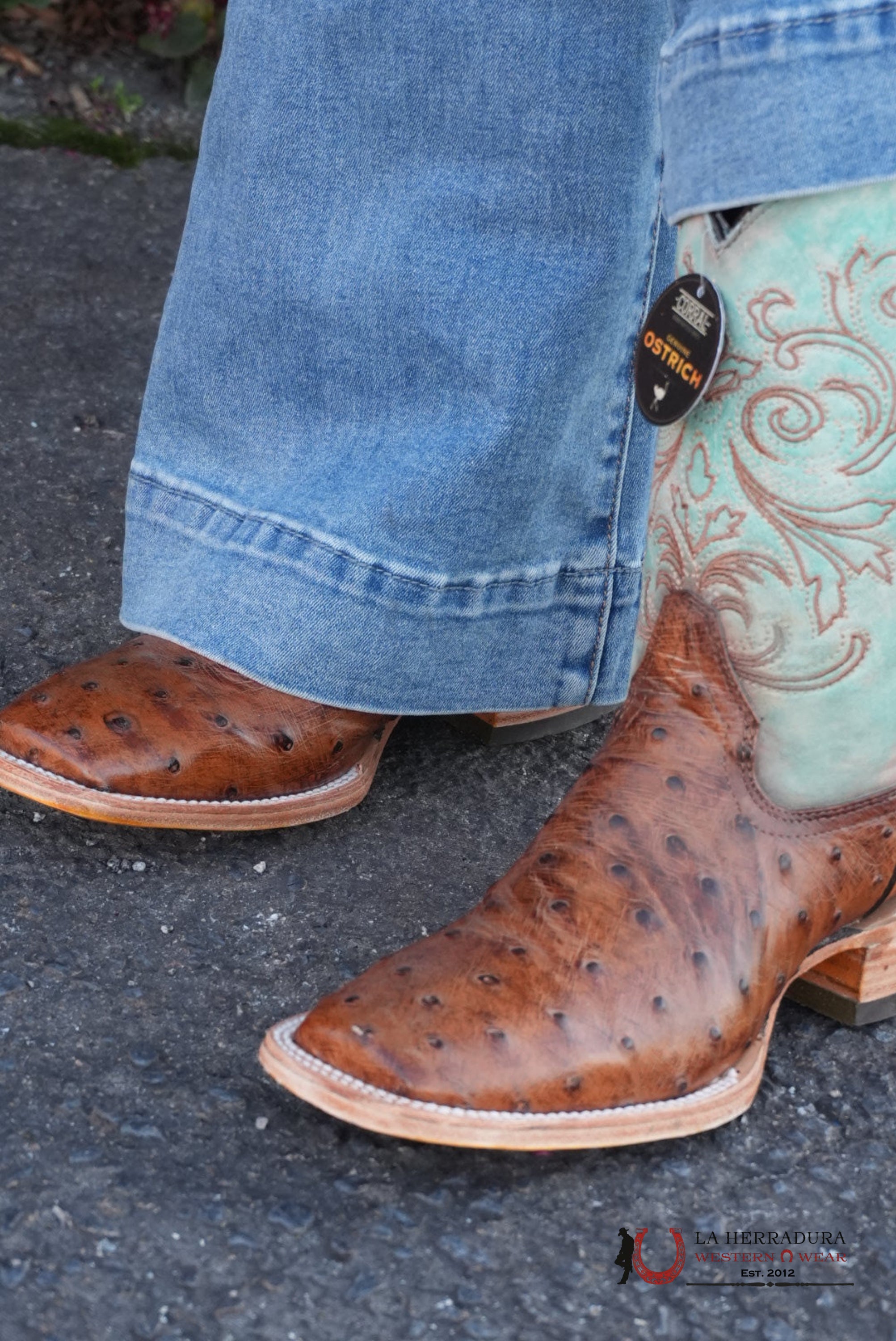 Step out in style with our CORRAL HONEY DISTRESSED BLUE OSTRICH EMBROIDERED boots! Made with real, genuine ostrich skin for an exotic and elegant touch. The distressed blue top adds a unique touch, while the square toe and sturdy build make these boots perfect for any woman looking to make a statement.