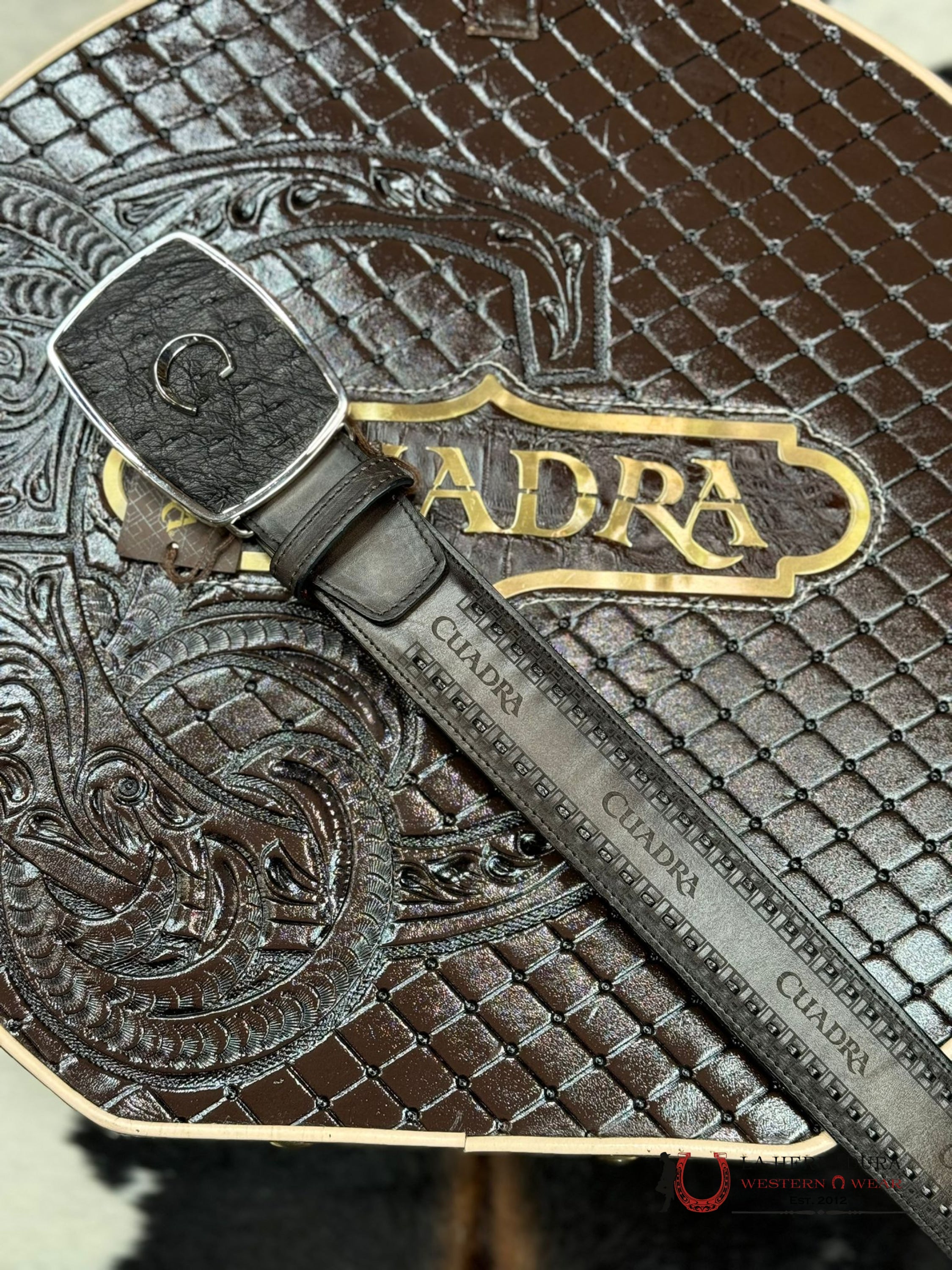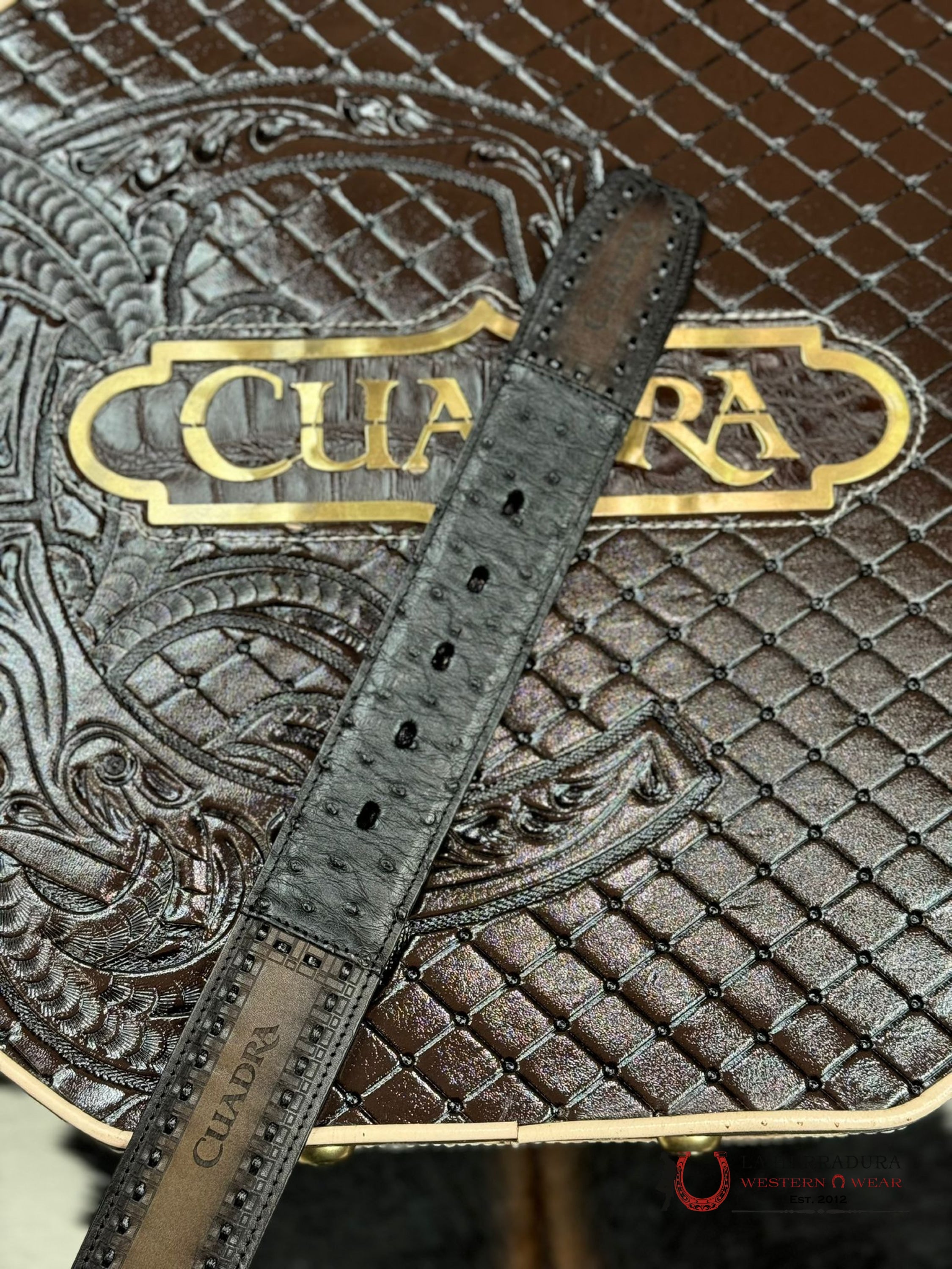Elevate your style with the CUADRA Black Ostrich Laser & Woven Belt. Handmade with exotic ostrich leather, this belt is the perfect combination of elegance and unique design. Stand out from the crowd and add this statement piece to your wardrobe.