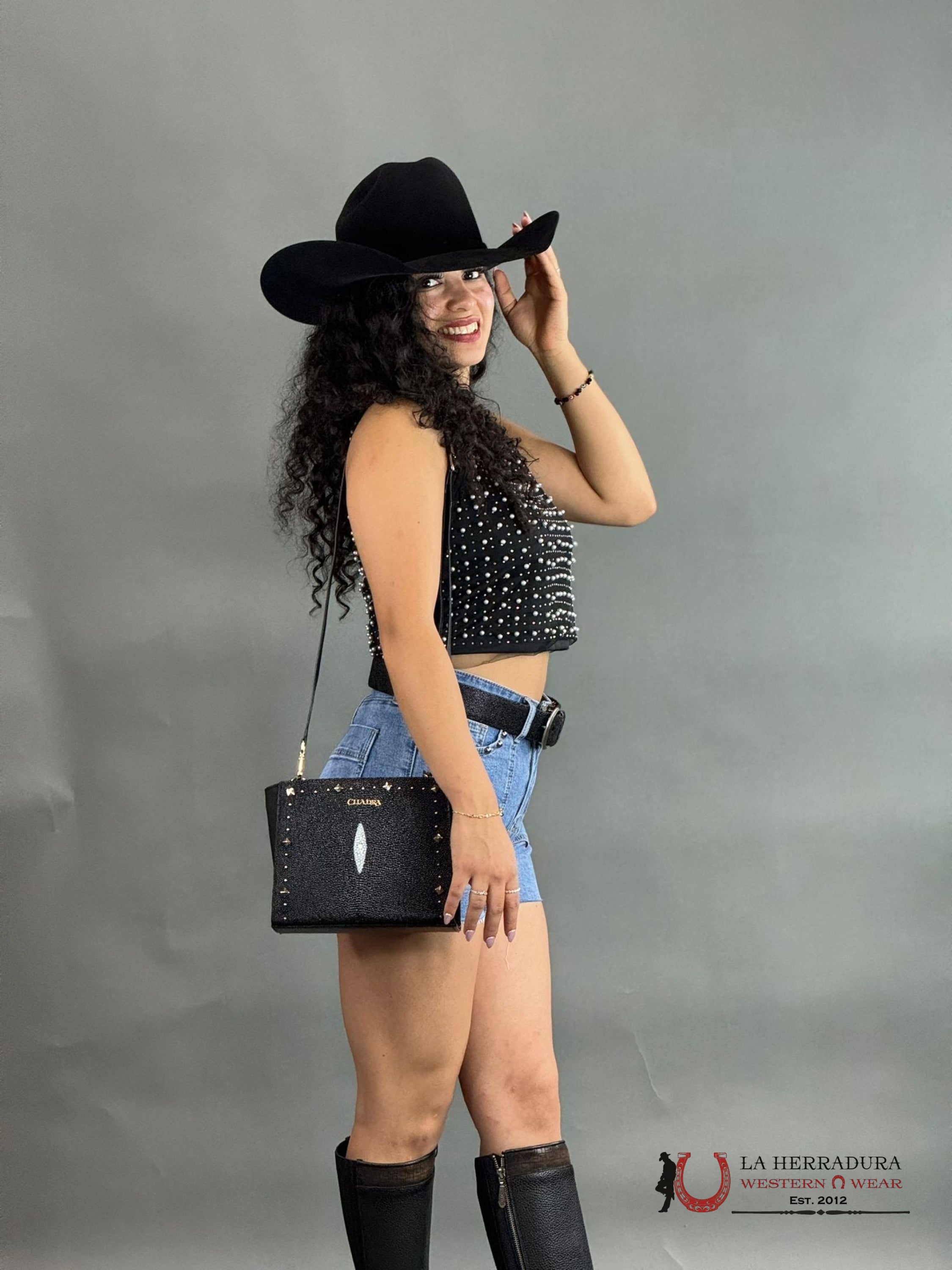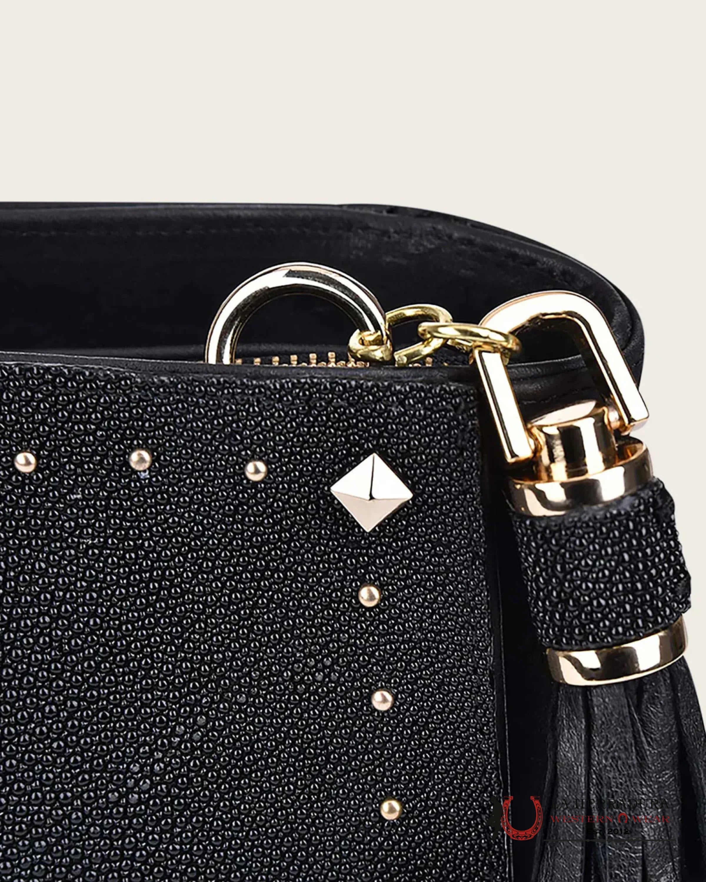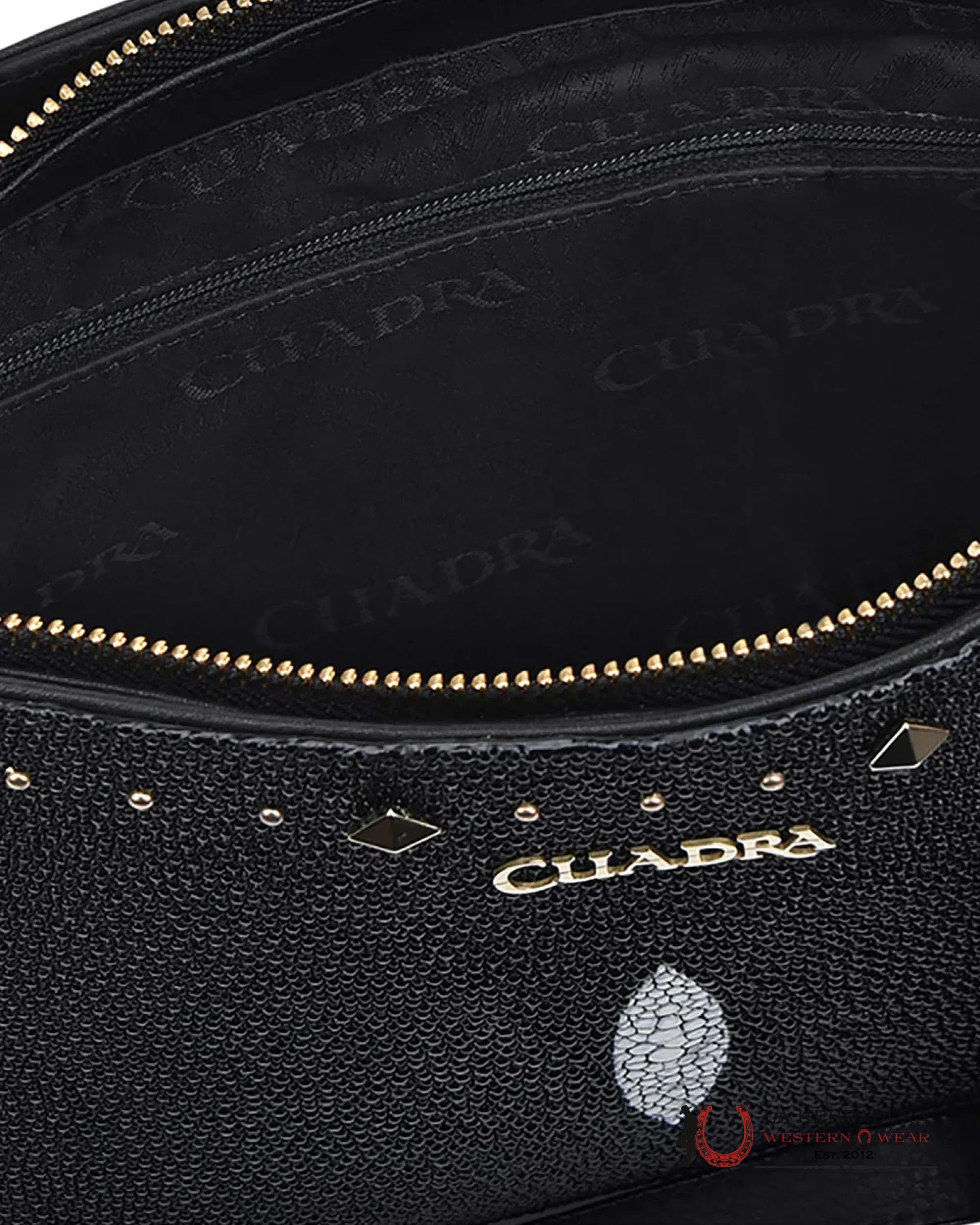 Indulge in luxury with the CUADRA Black Stingray Embroidery Handbag. Perfect for the elegant and fancy woman, this exotic handbag features exquisite stingray embroidery. With its unique design and versatile cross body style, it's the perfect accessory to elevate any outfit.