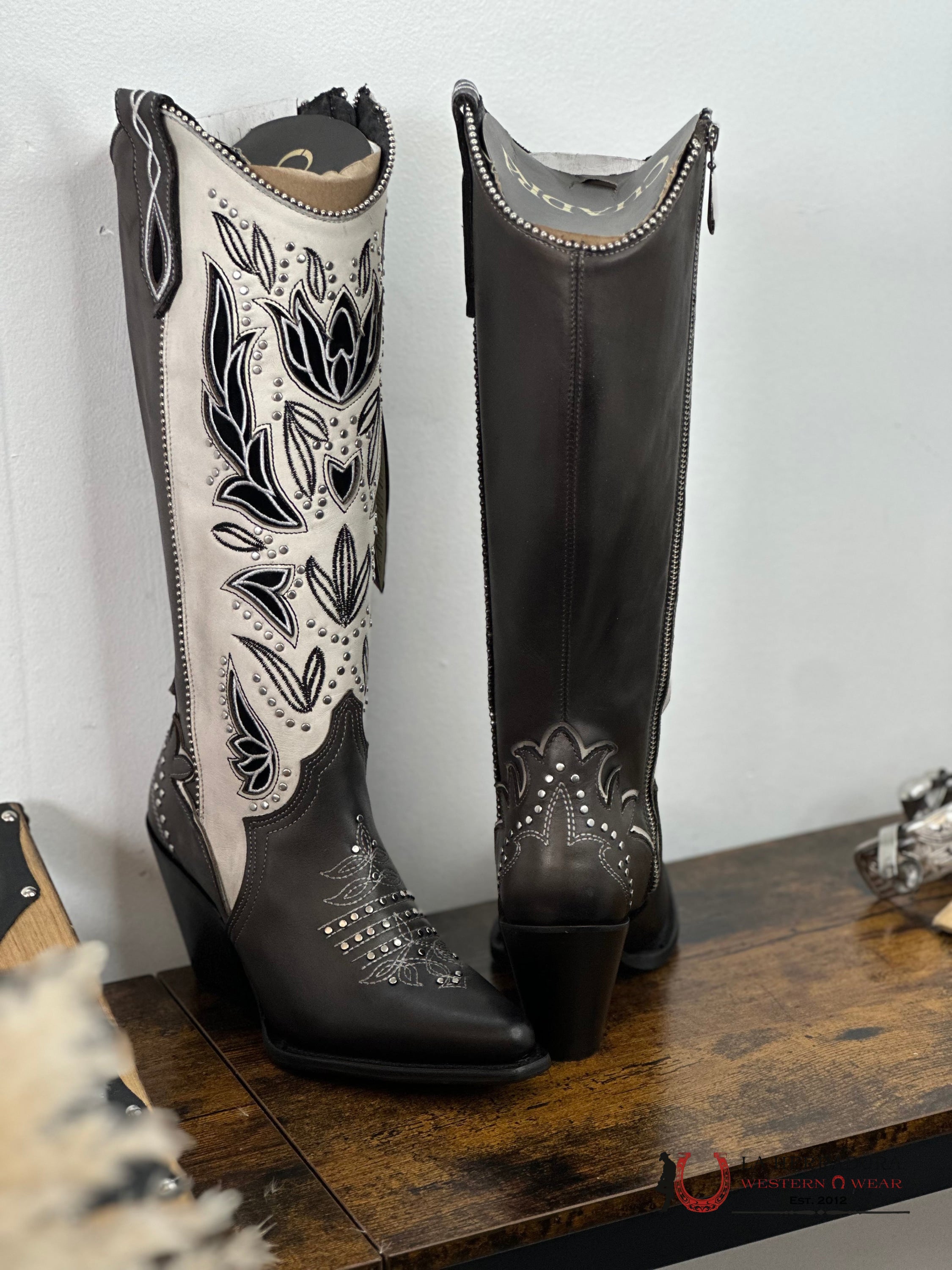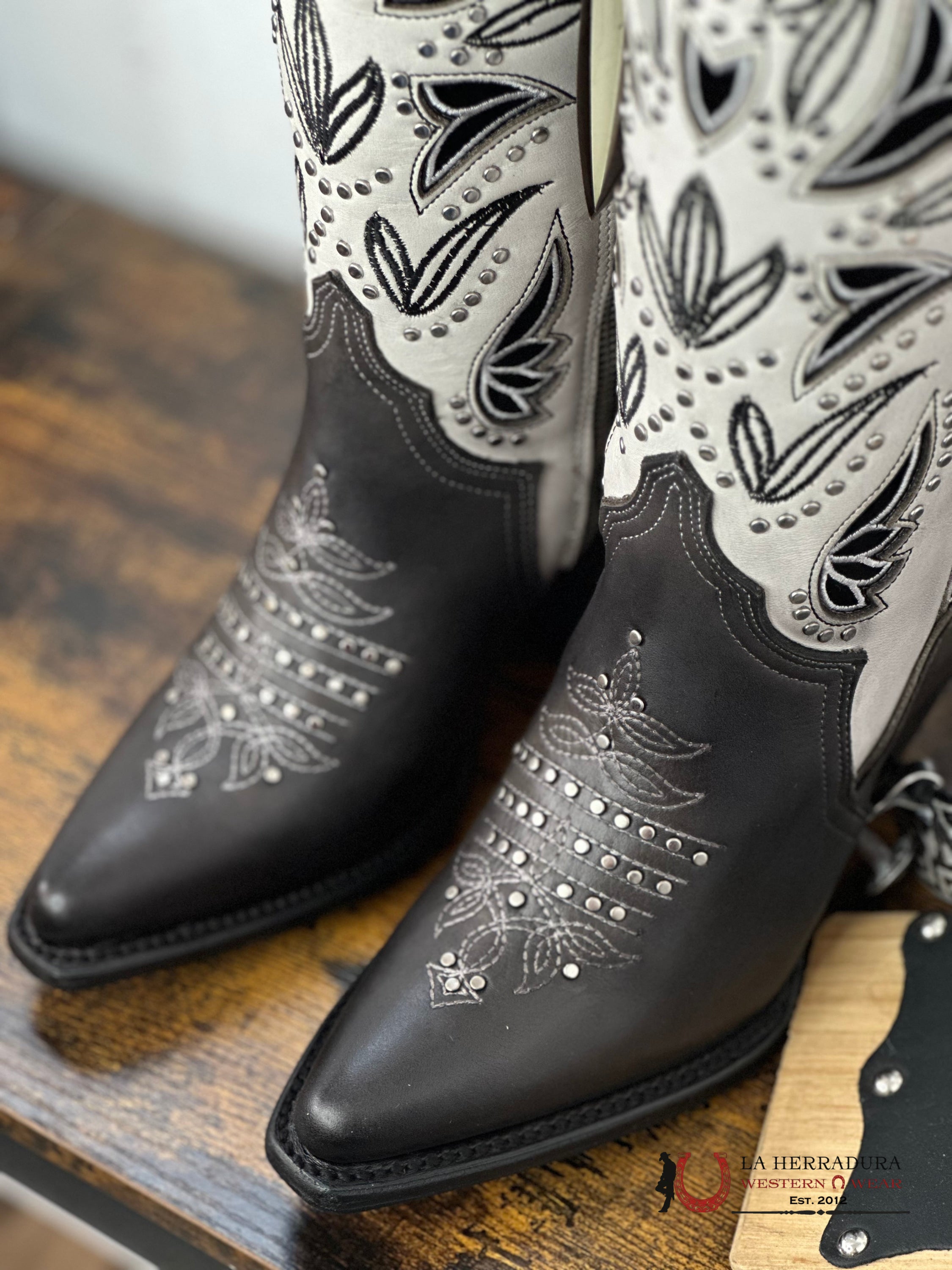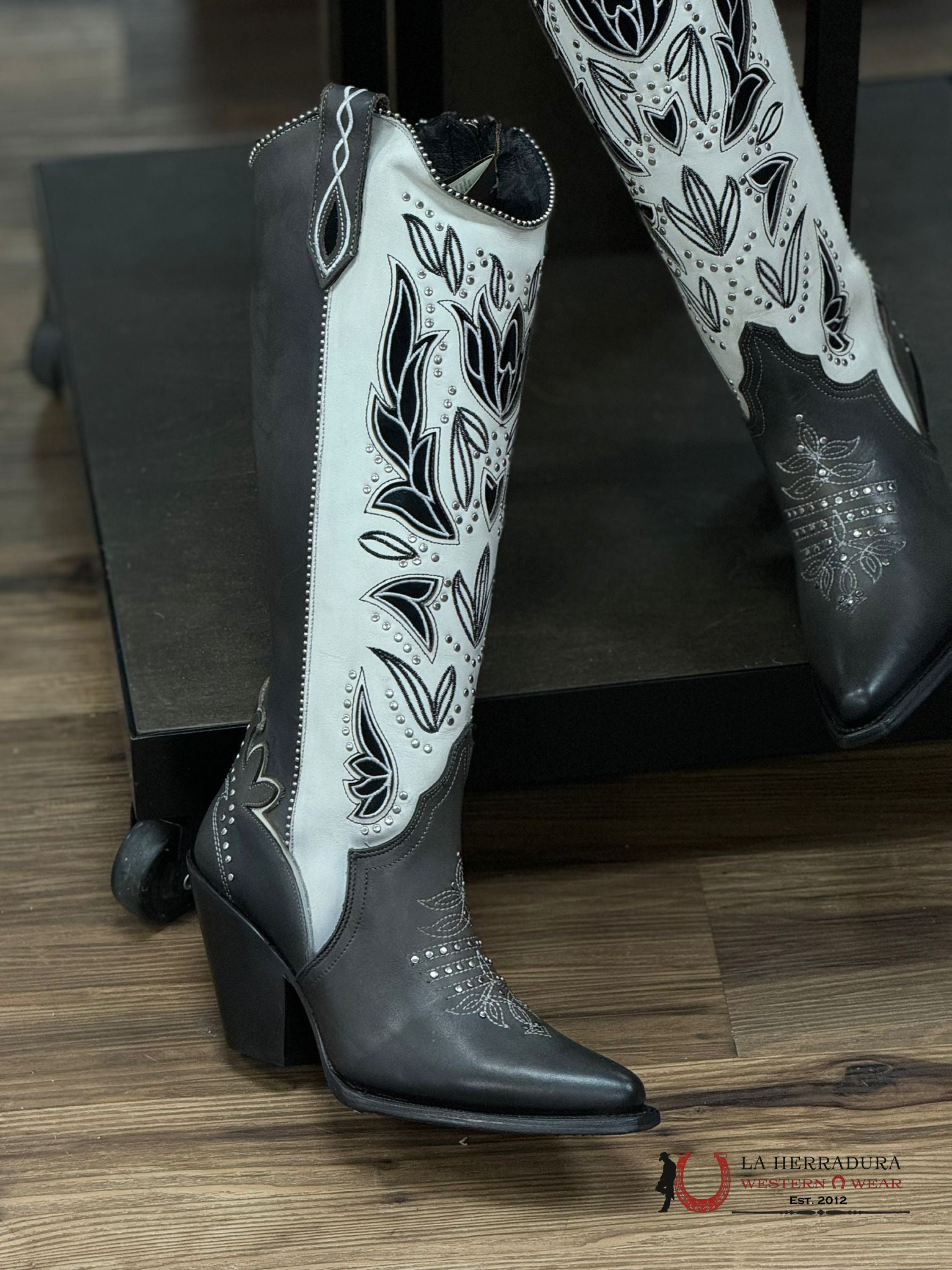 Experience the ultimate in elegance with the CUADRA Womens Res Crust Tokio Grey Embroidery & Cut Out Studs Snip Toe Tall Boot. The pointed toe and heel add a touch of sophistication, while the unique cut-out and embroidery details bring a luxurious and feminine touch to these tall boots. Perfect for any stylish and confident woman.