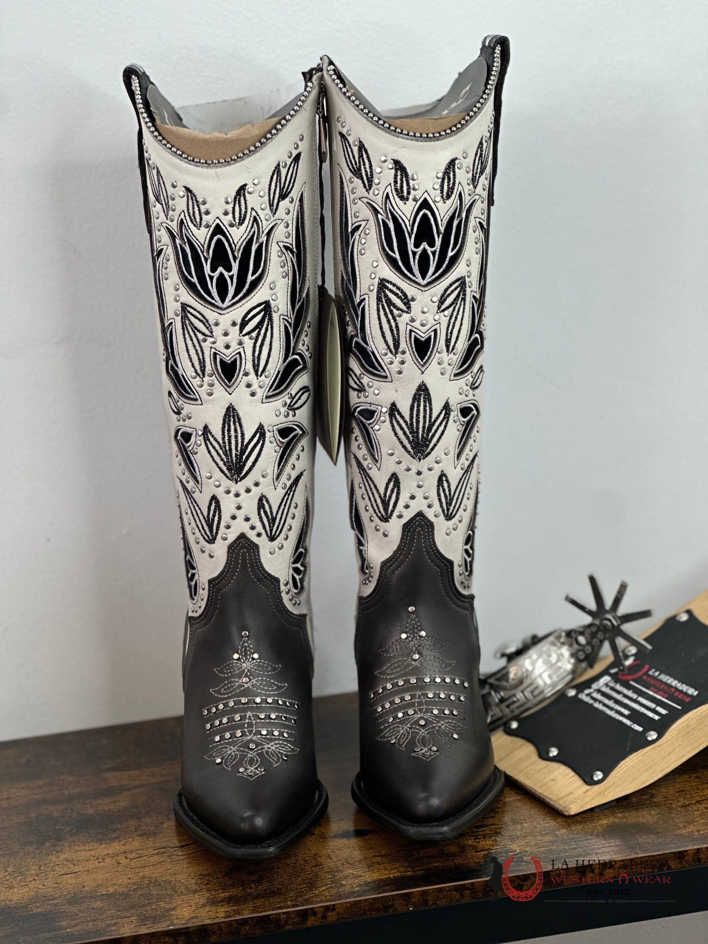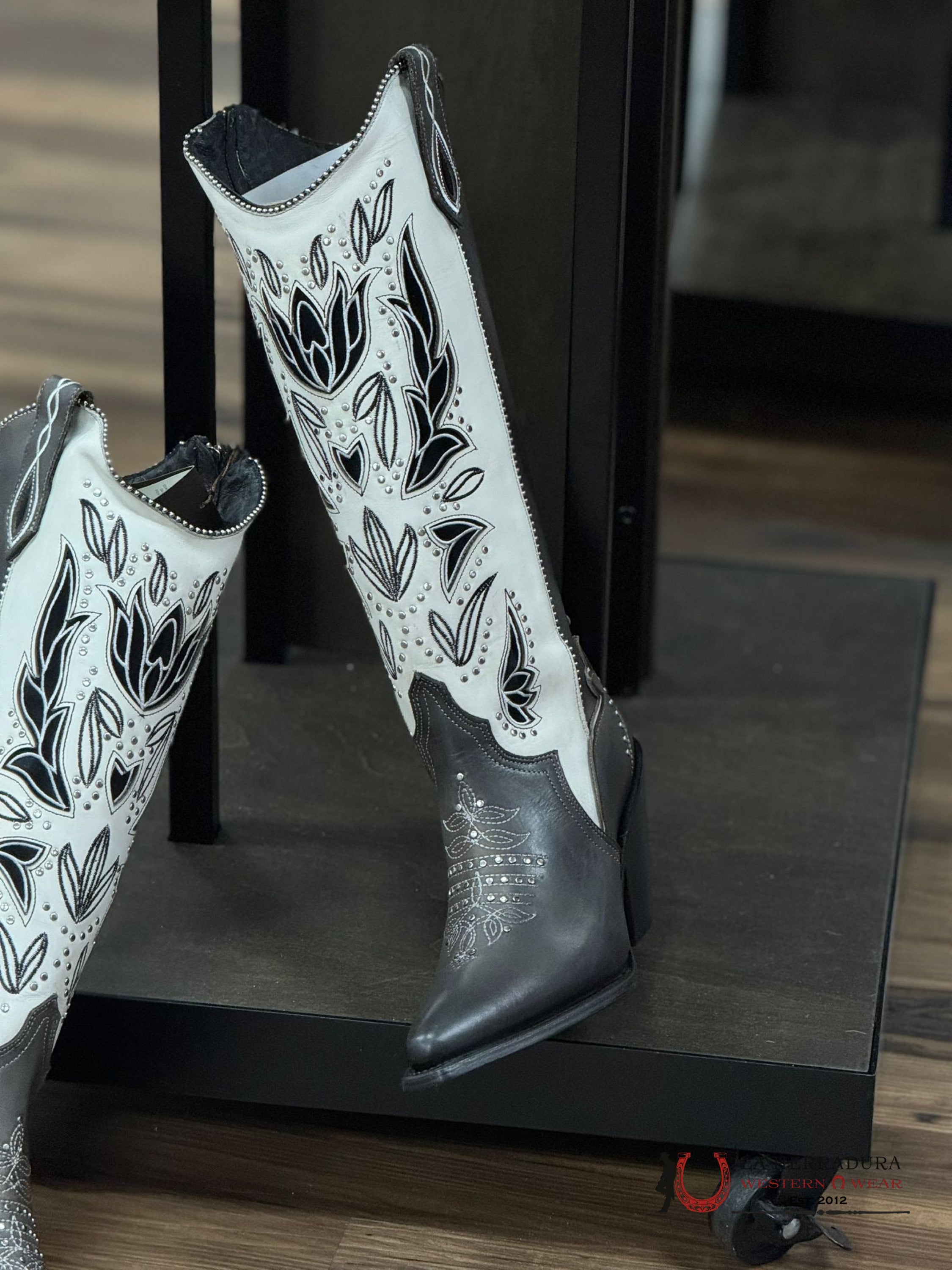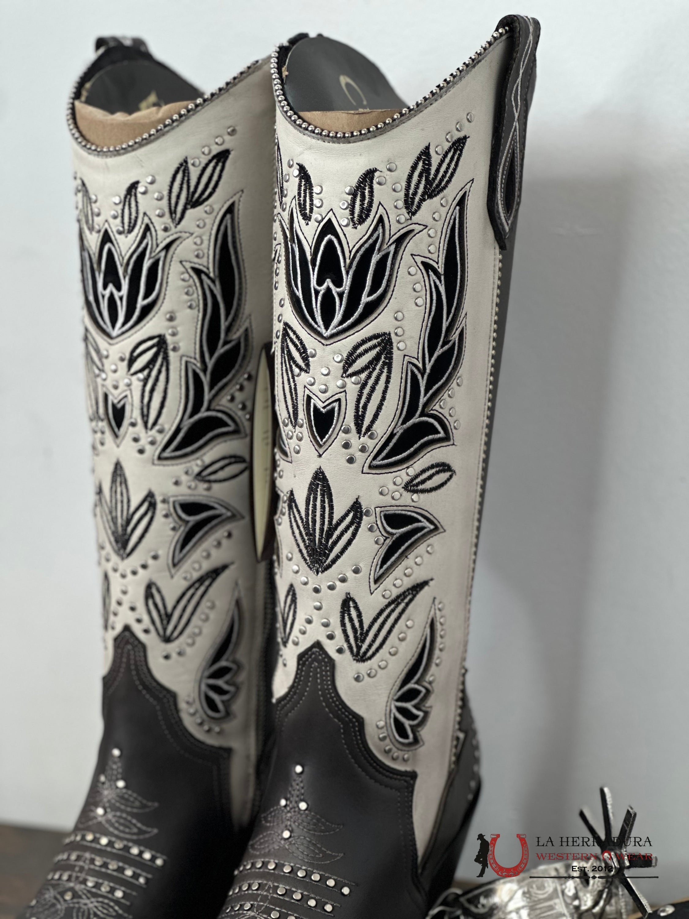 Experience the ultimate in elegance with the CUADRA Womens Res Crust Tokio Grey Embroidery & Cut Out Studs Snip Toe Tall Boot. The pointed toe and heel add a touch of sophistication, while the unique cut-out and embroidery details bring a luxurious and feminine touch to these tall boots. Perfect for any stylish and confident woman.