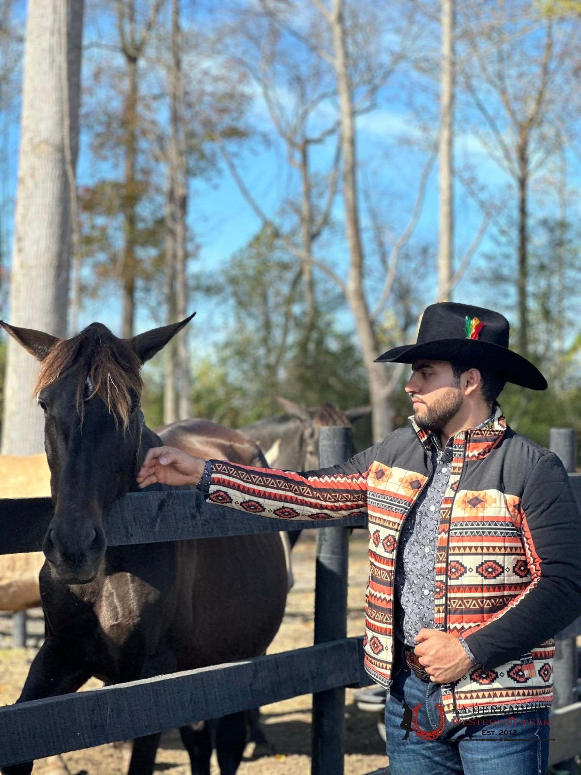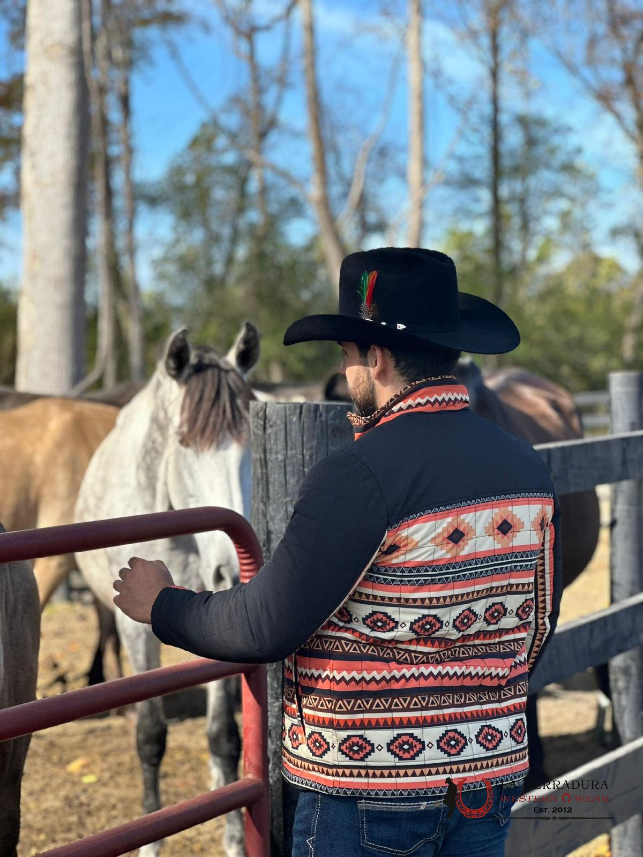 Distinctive in its Aztec design, our navy jacket offers versatile function and unmatched ranch style. Bonded poly-spandex construction provides freedom of movement and good weather protection. Additional details include contrast lining, exterior zip pockets, embroidered logo, and durable water-resistant (DWR) finish.