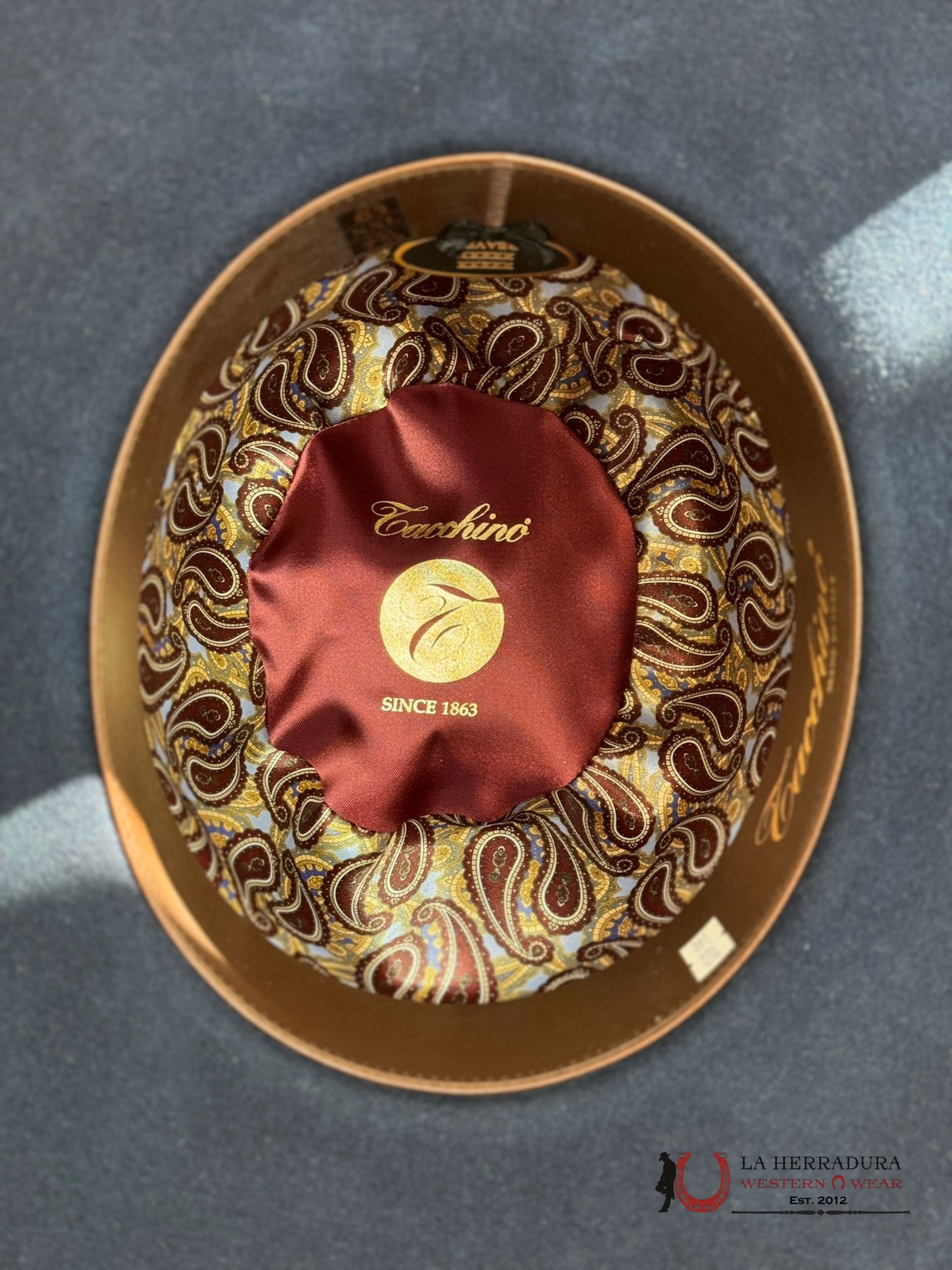 Elevate your style with our MENS TACCHINO FELT HAT, crafted with luxurious BEAVER felt and SILK interior for ultimate comfort. Our 10X quality ensures durability, while the 3-PIECE BUCKLE adds a touch of elegance. The OPEN CROWN design and LEATHER SWEATBAND provide a perfect fit.
