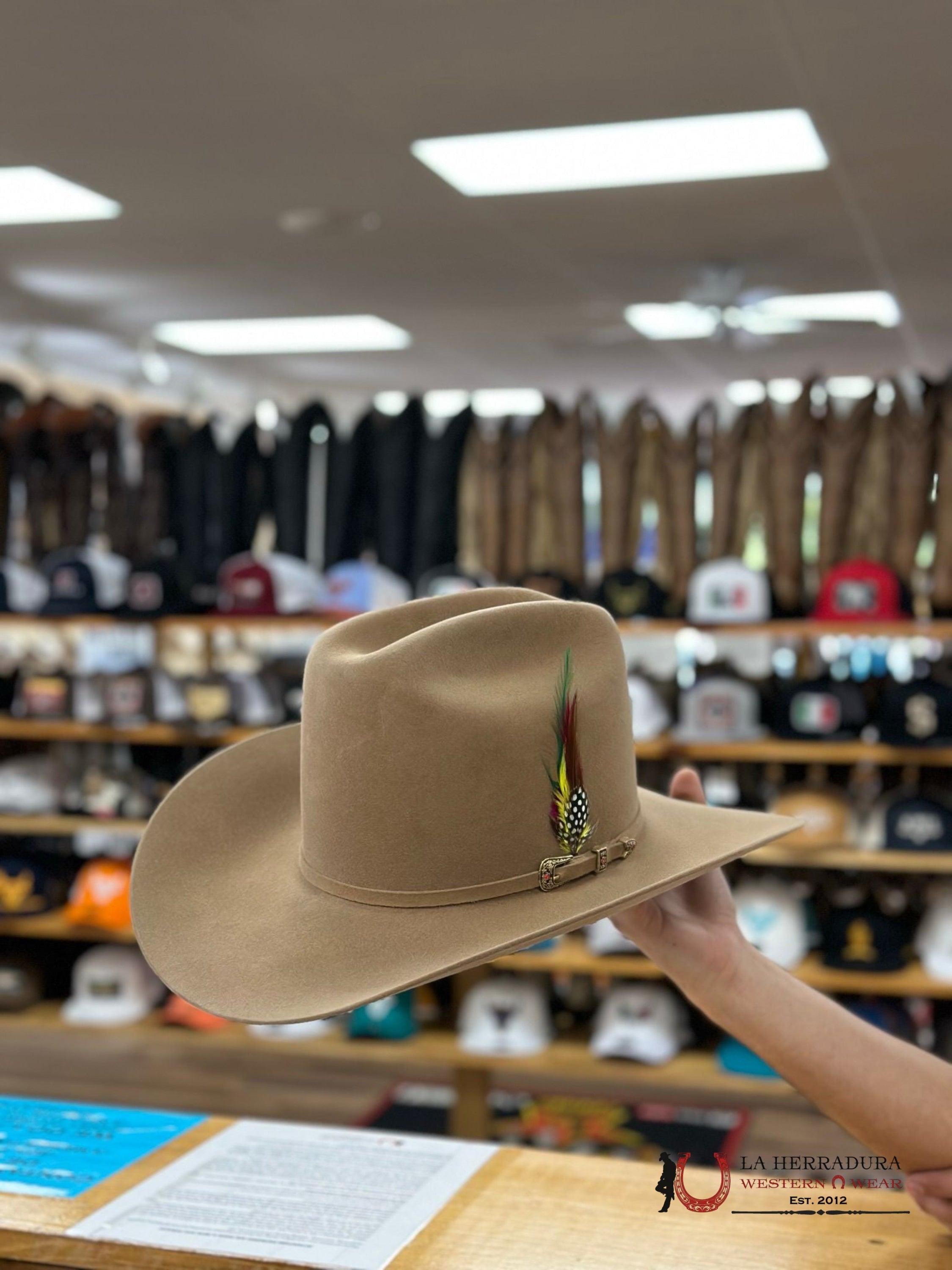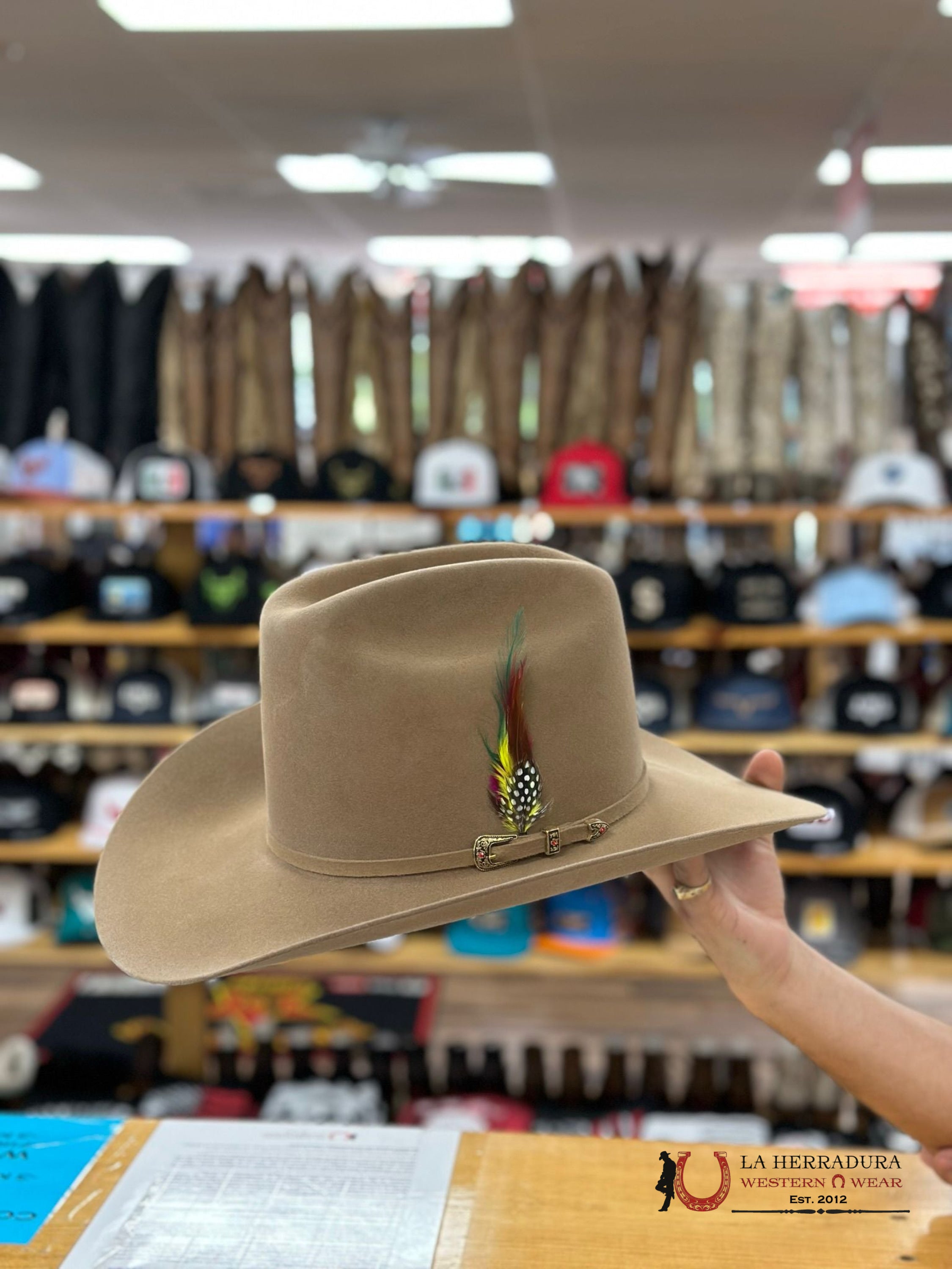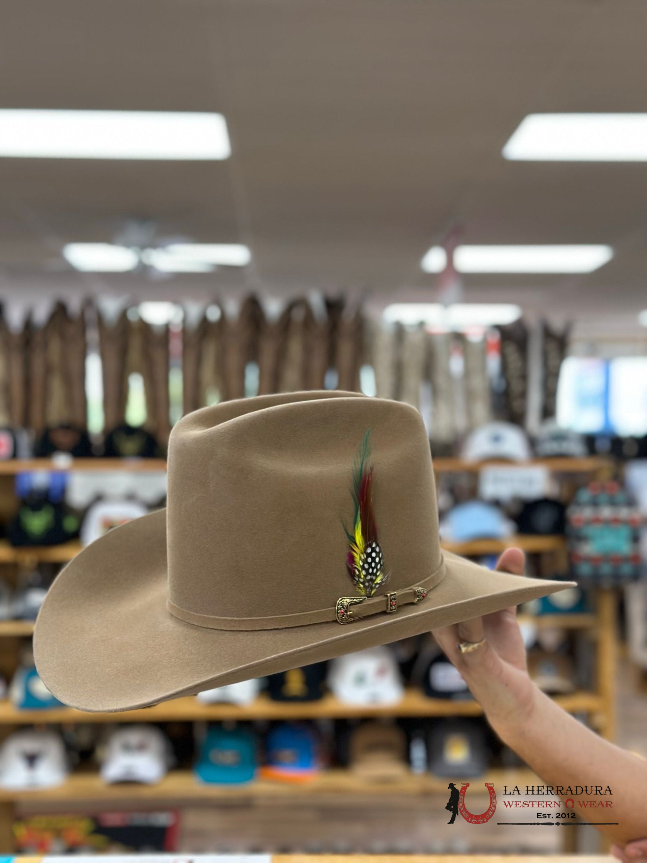 Step out in style with the RDR 10X Pecan El Patron Cowboy Hat. Crafted from the finest beaver hair, this stylish copa alta with its trio of buckles and colorful feather will take any look to the next level. With its unbeatable quality and timeless style, this hat is sure to be a wardrobe favorite. We can shape