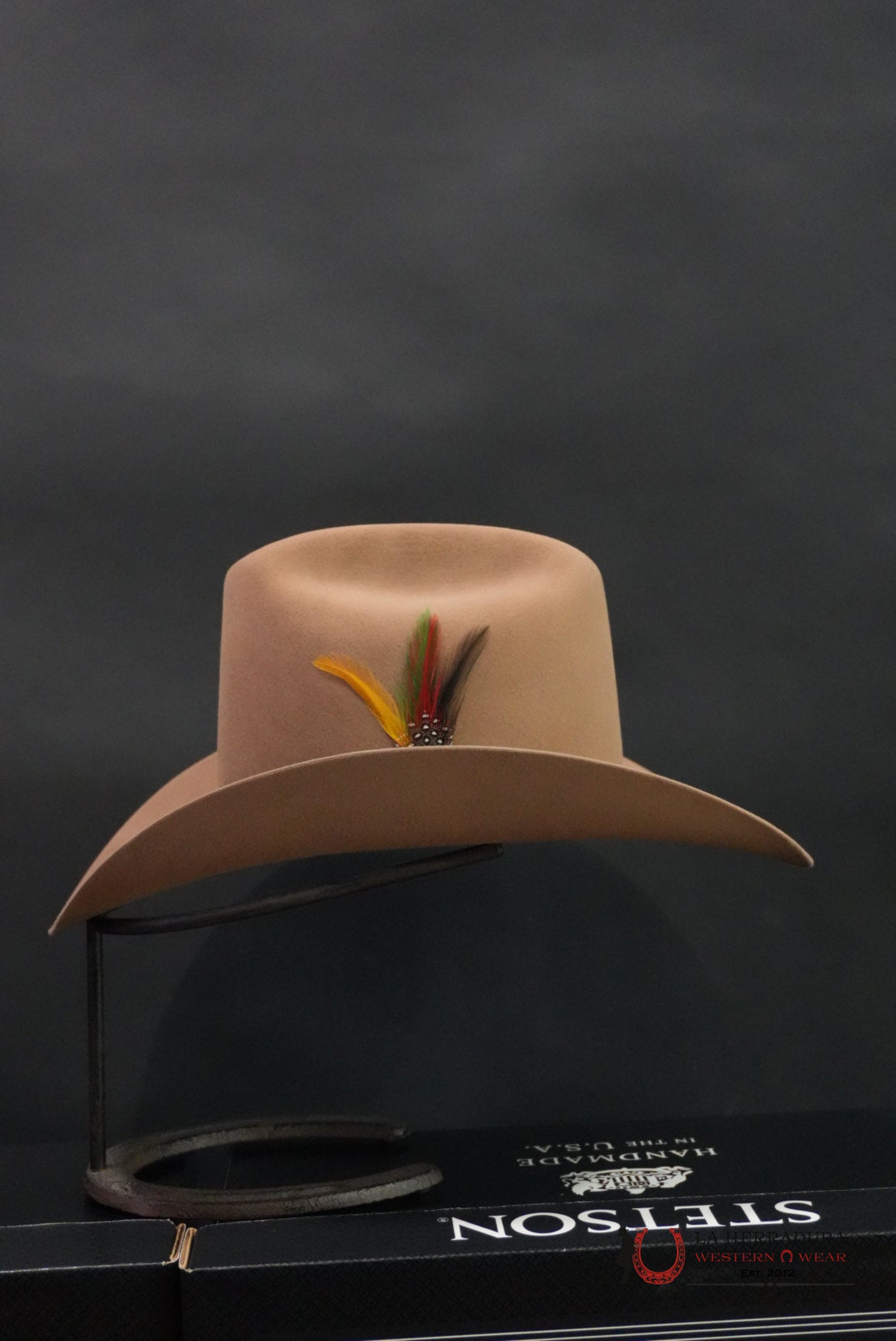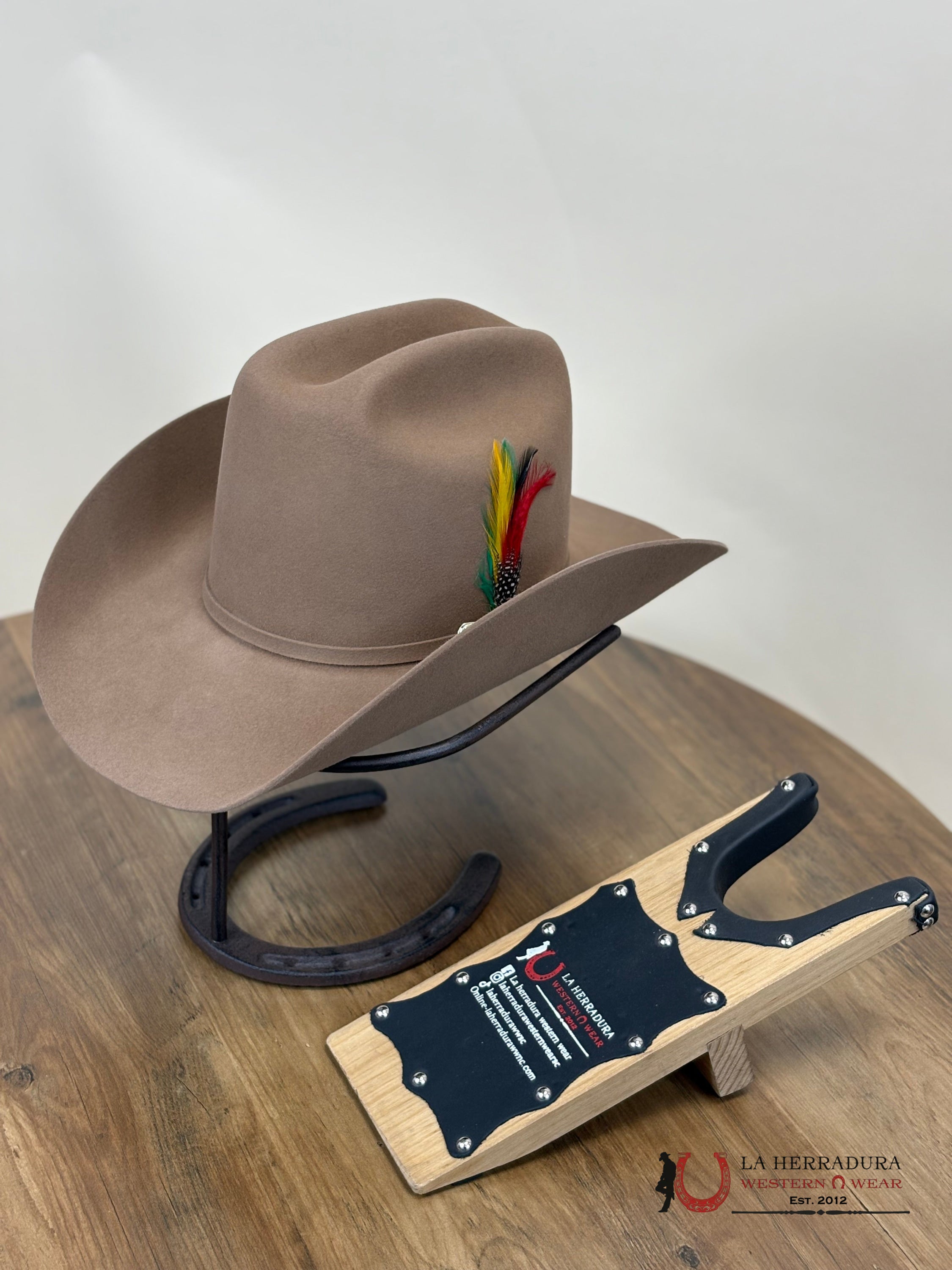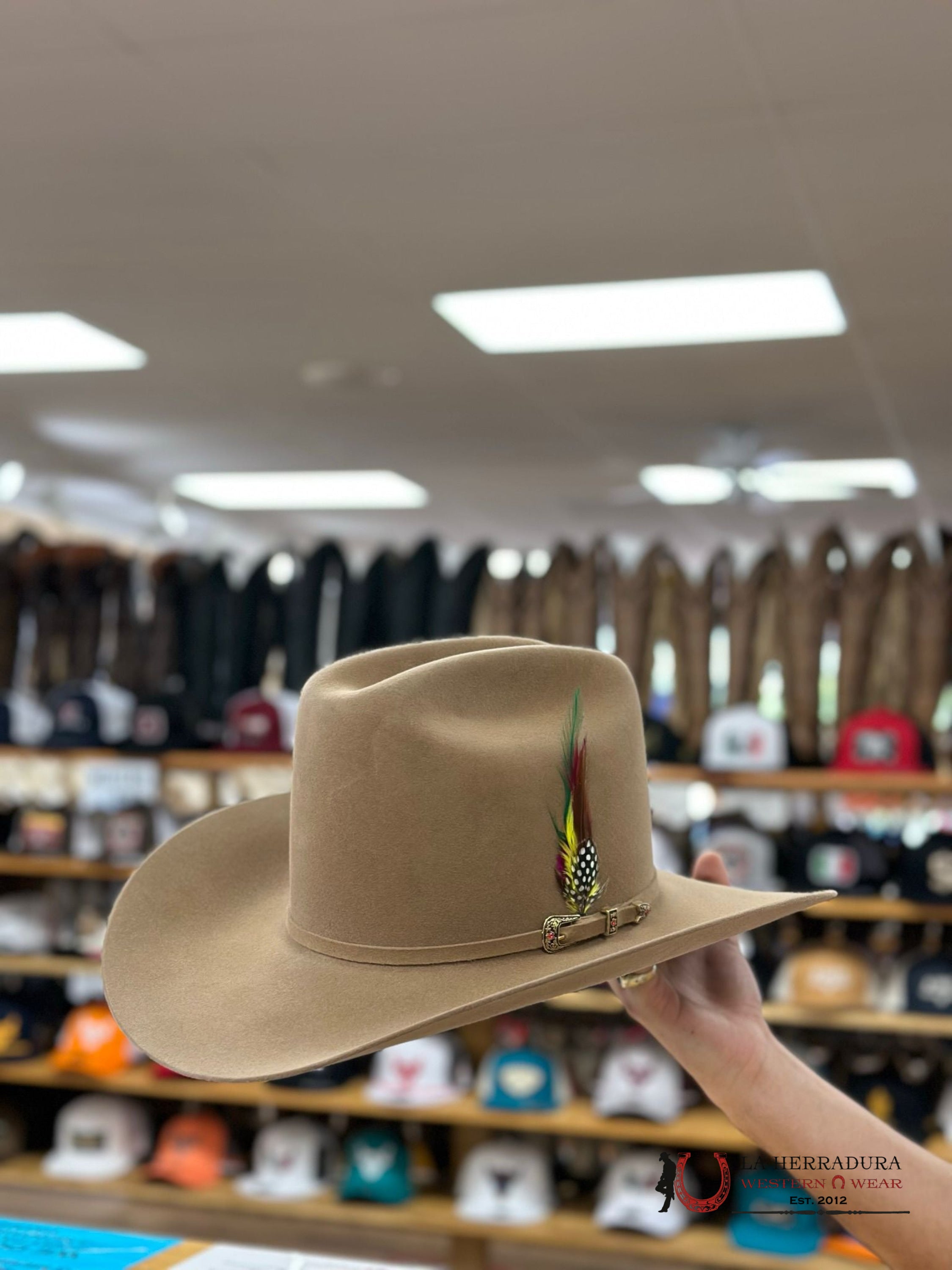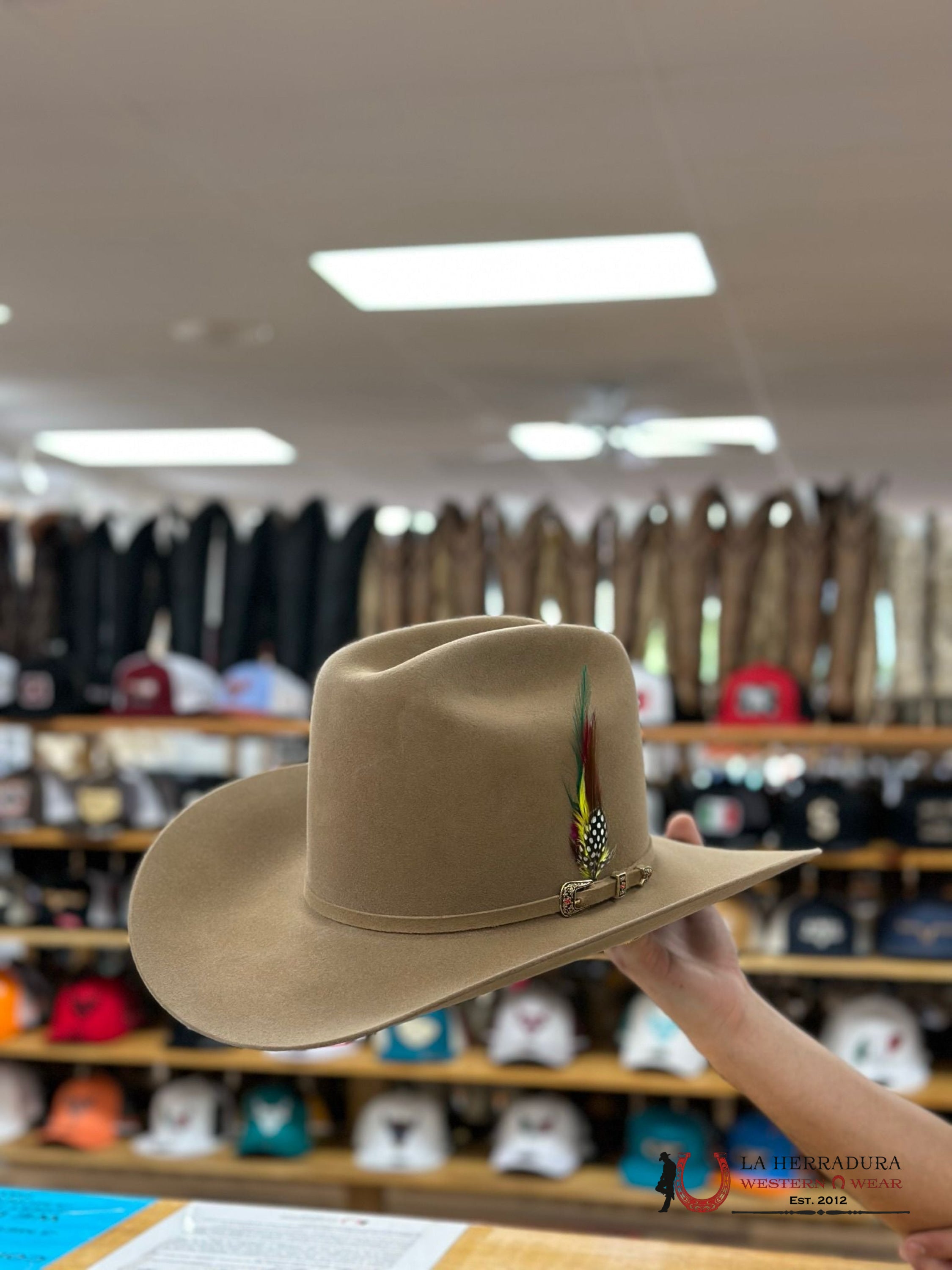 Step out in style with the RDR 10X Pecan El Patron Cowboy Hat. Crafted from the finest beaver hair, this stylish copa alta with its trio of buckles and colorful feather will take any look to the next level. With its unbeatable quality and timeless style, this hat is sure to be a wardrobe favorite. We can shape