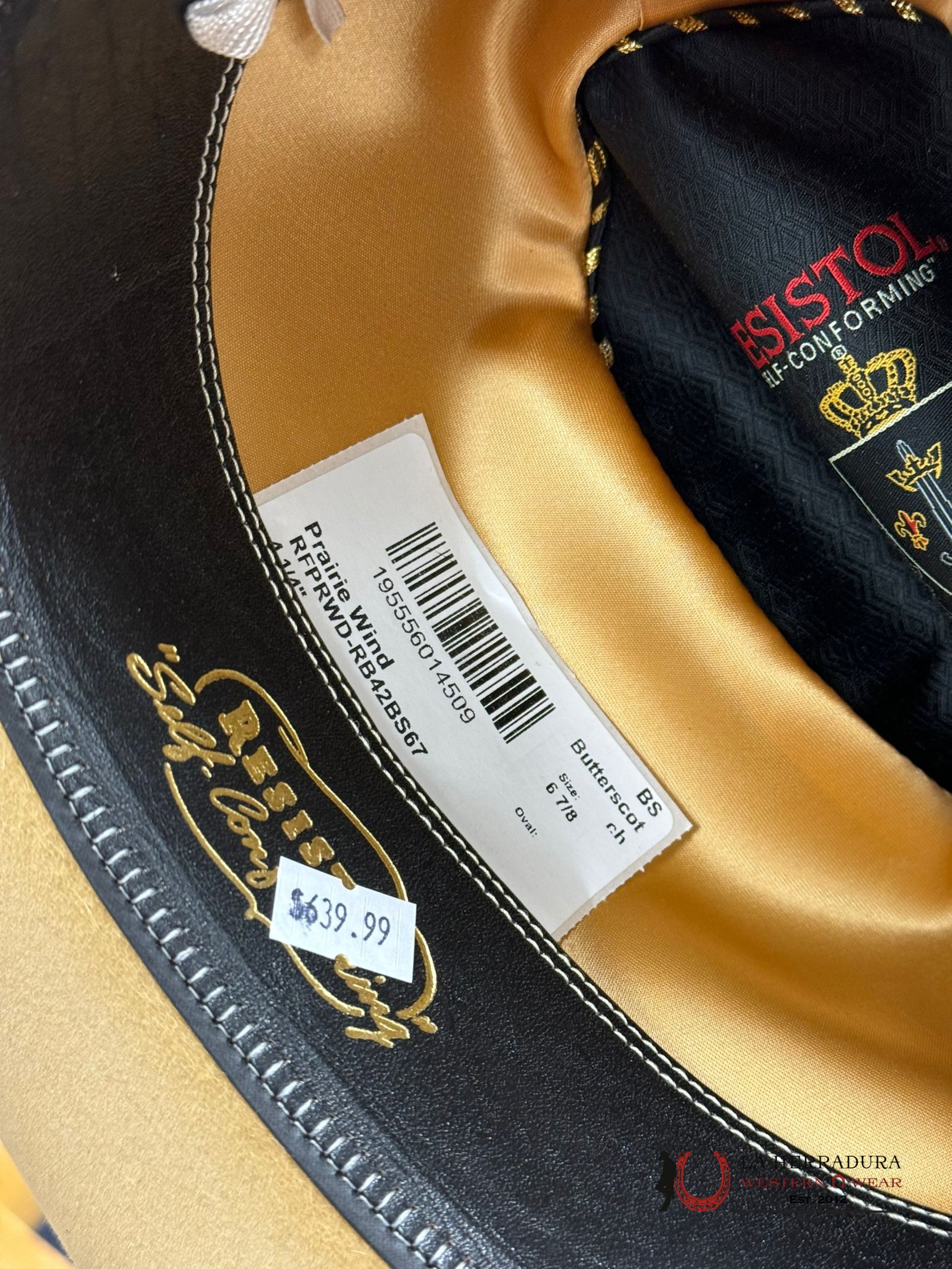 This ultra-luxurious Resistol Prairie Wind Butterscotch is crafted from the finest beaver fur, with a 30x felt construction and feathered edge for superior protection. A sleek satin lining and 4 1/4 inch brim keep you looking stylish. Proudly made in the USA. (NO INCLUYE PLUMA)
