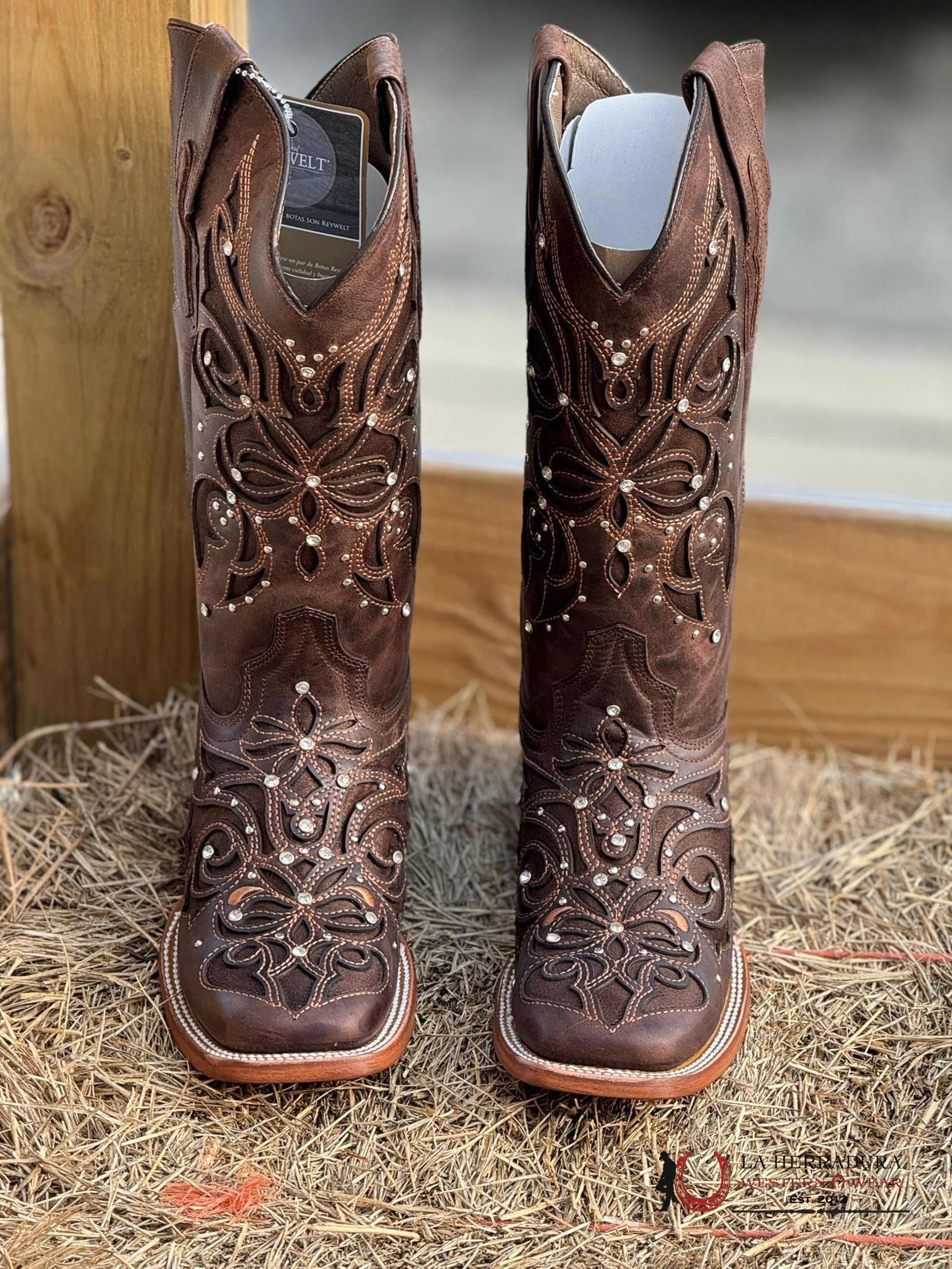 Dazzle in the REYWELT MIRANDA HEISER ORO BOOT! With a sparkly, gold rhinestone design, these cute brown boots are perfect for dressing up any outfit. Step into style and elevate your look with these eye-catching shoes.