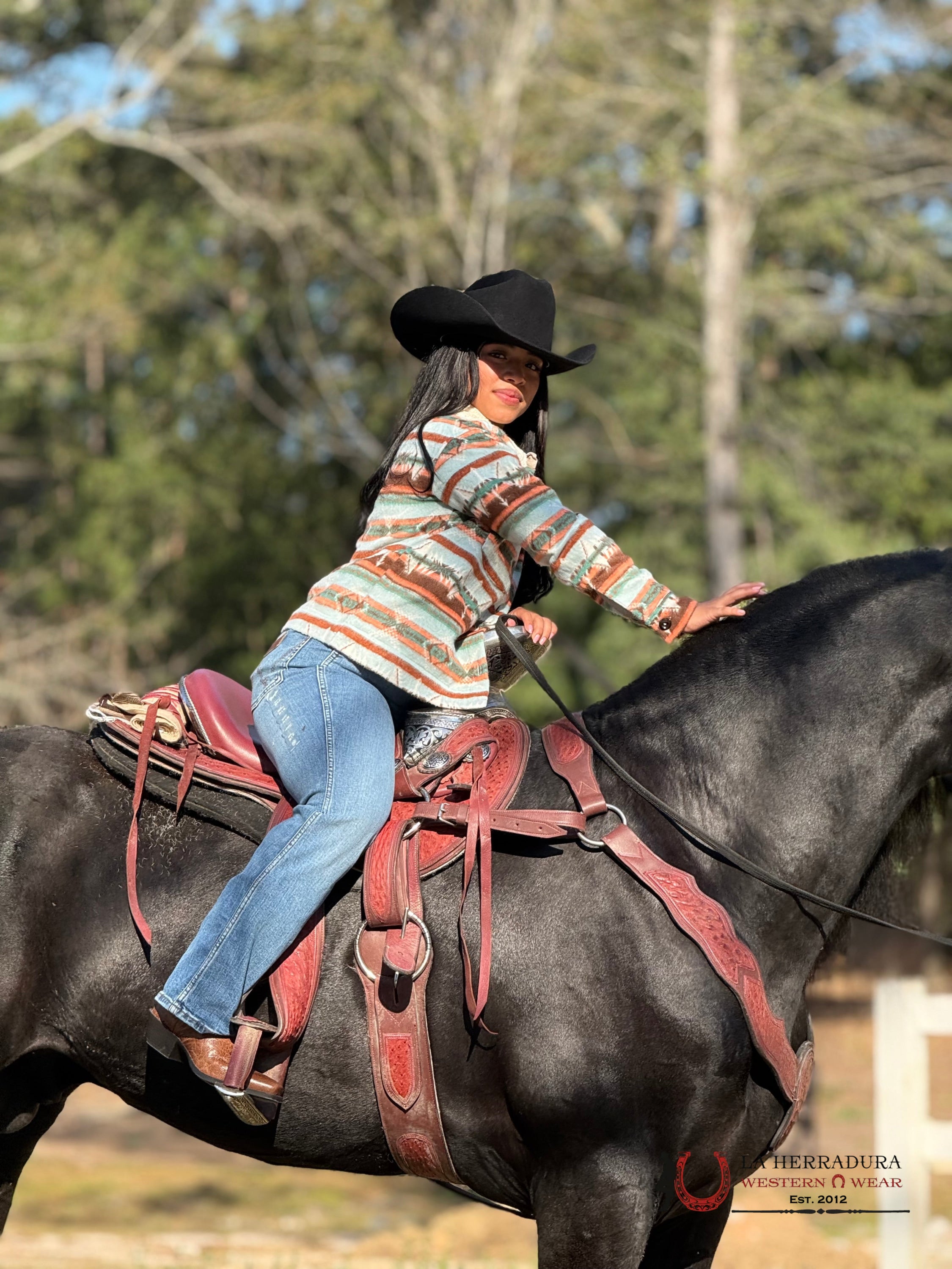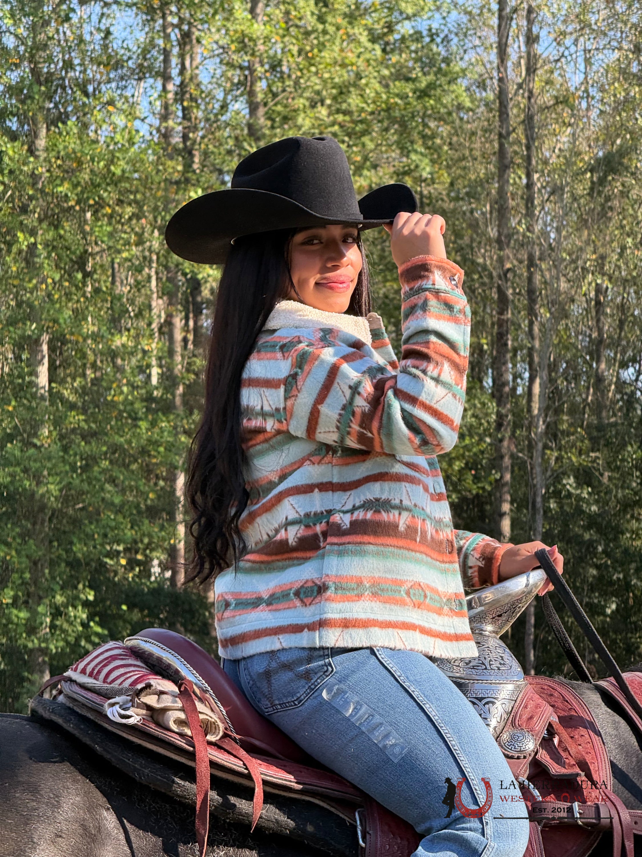 The Rock&Roll Womens Aztec Button Up Jacket in Orange/Teal (BW92C04496) features a bold Aztec design in light turquoise. Made for fierce and fashionable women, this jacket adds a touch of rock and roll to any outfit. Elevate your style with this statement piece.