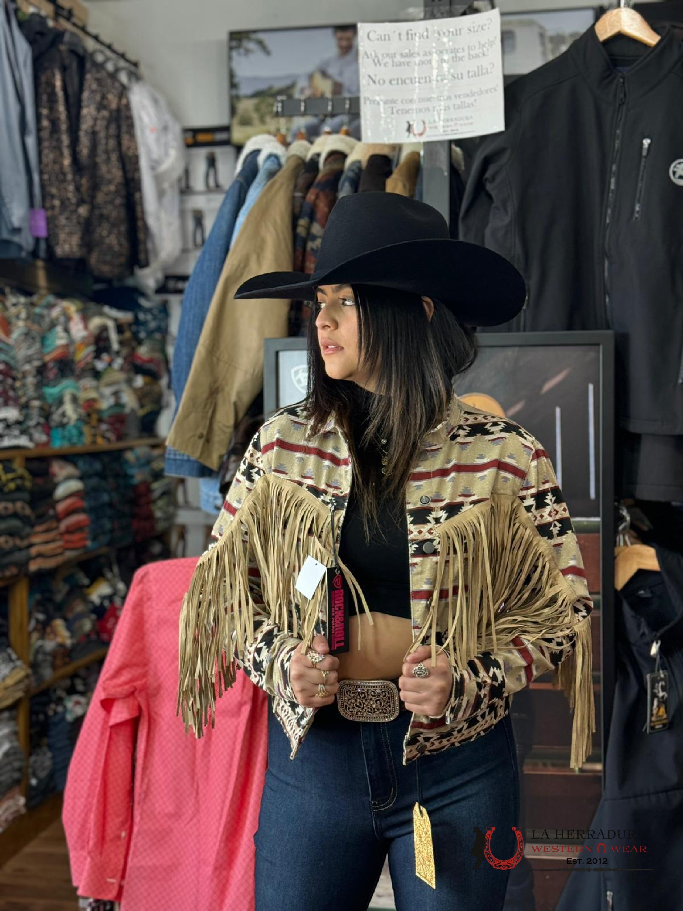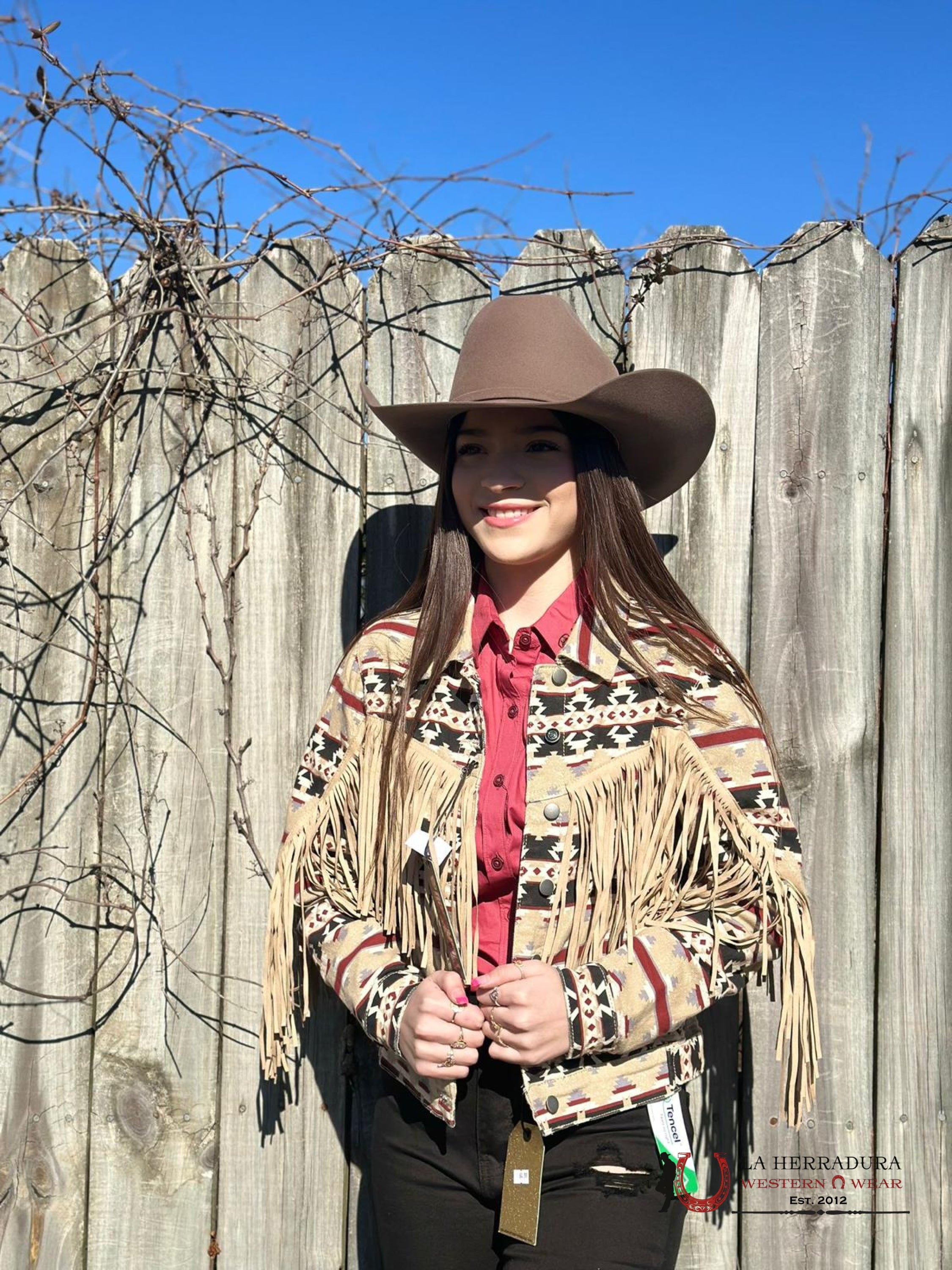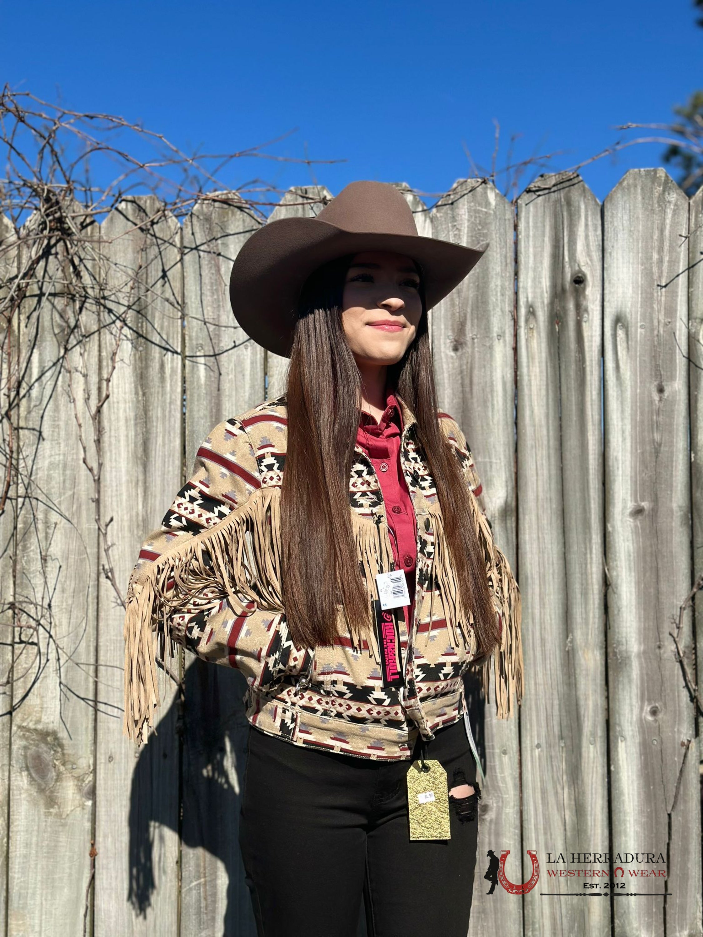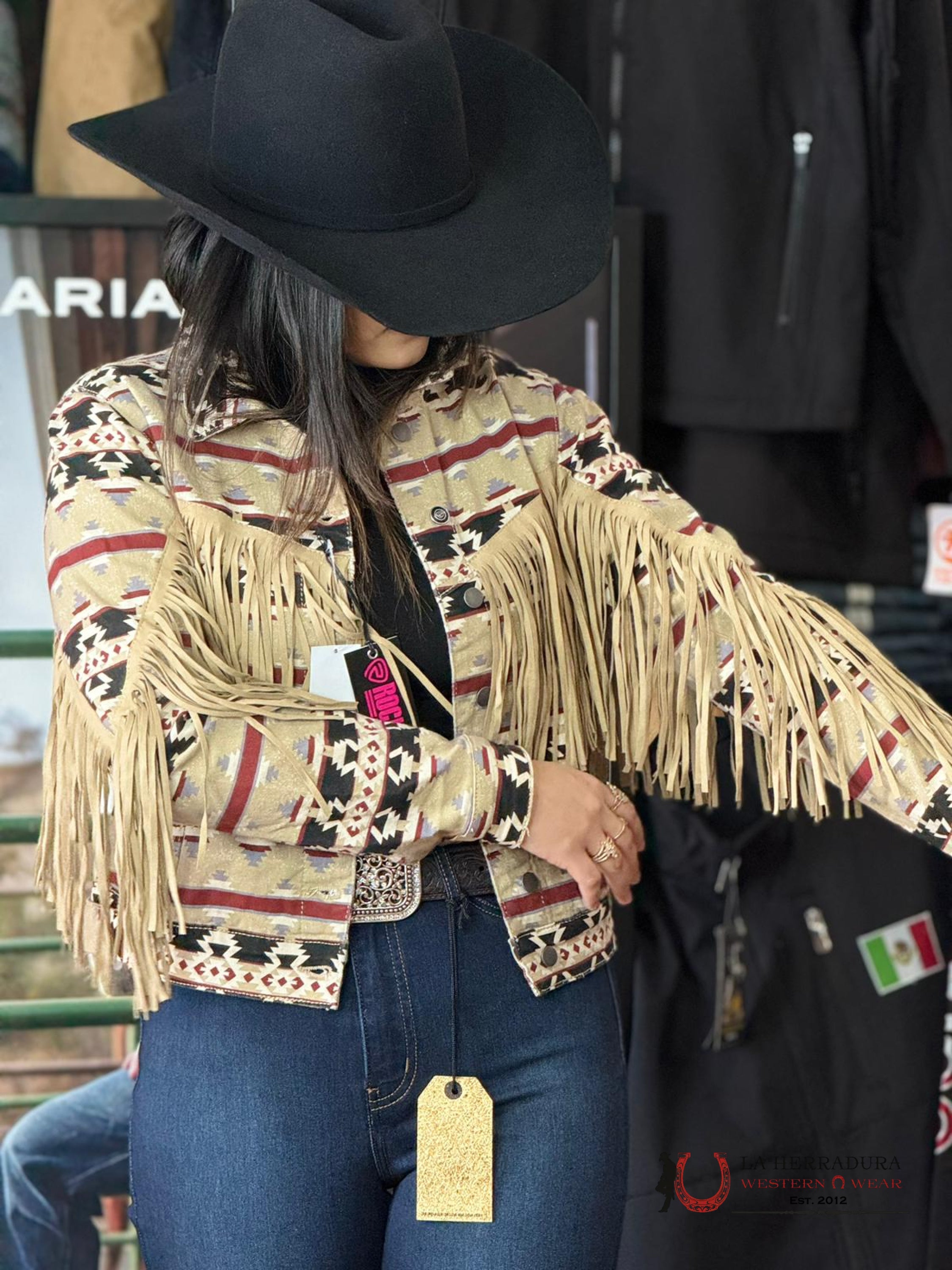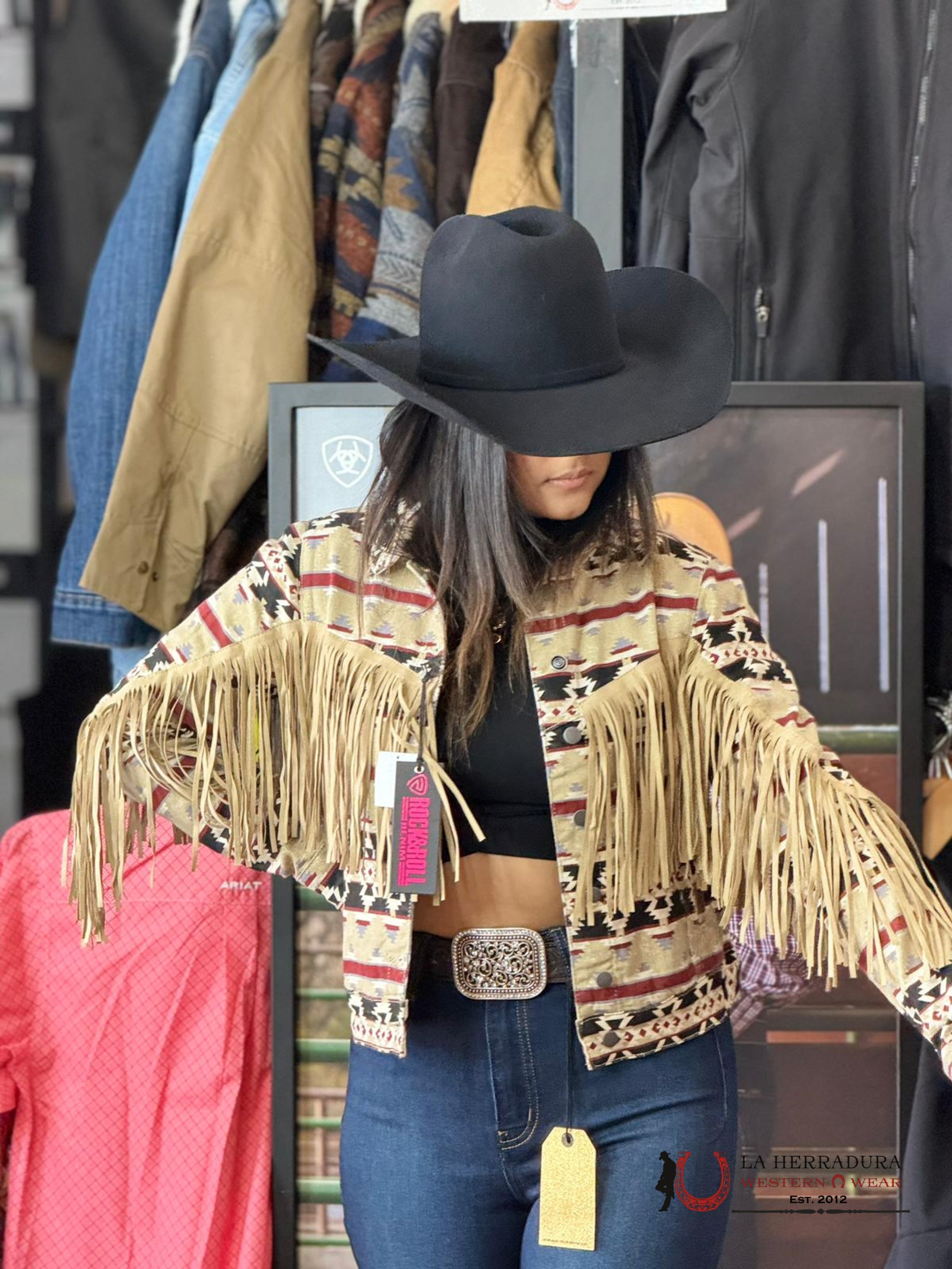 Rock&Roll Womens Tan Aztec Fringe Denim Jacket RRWD92RZQB