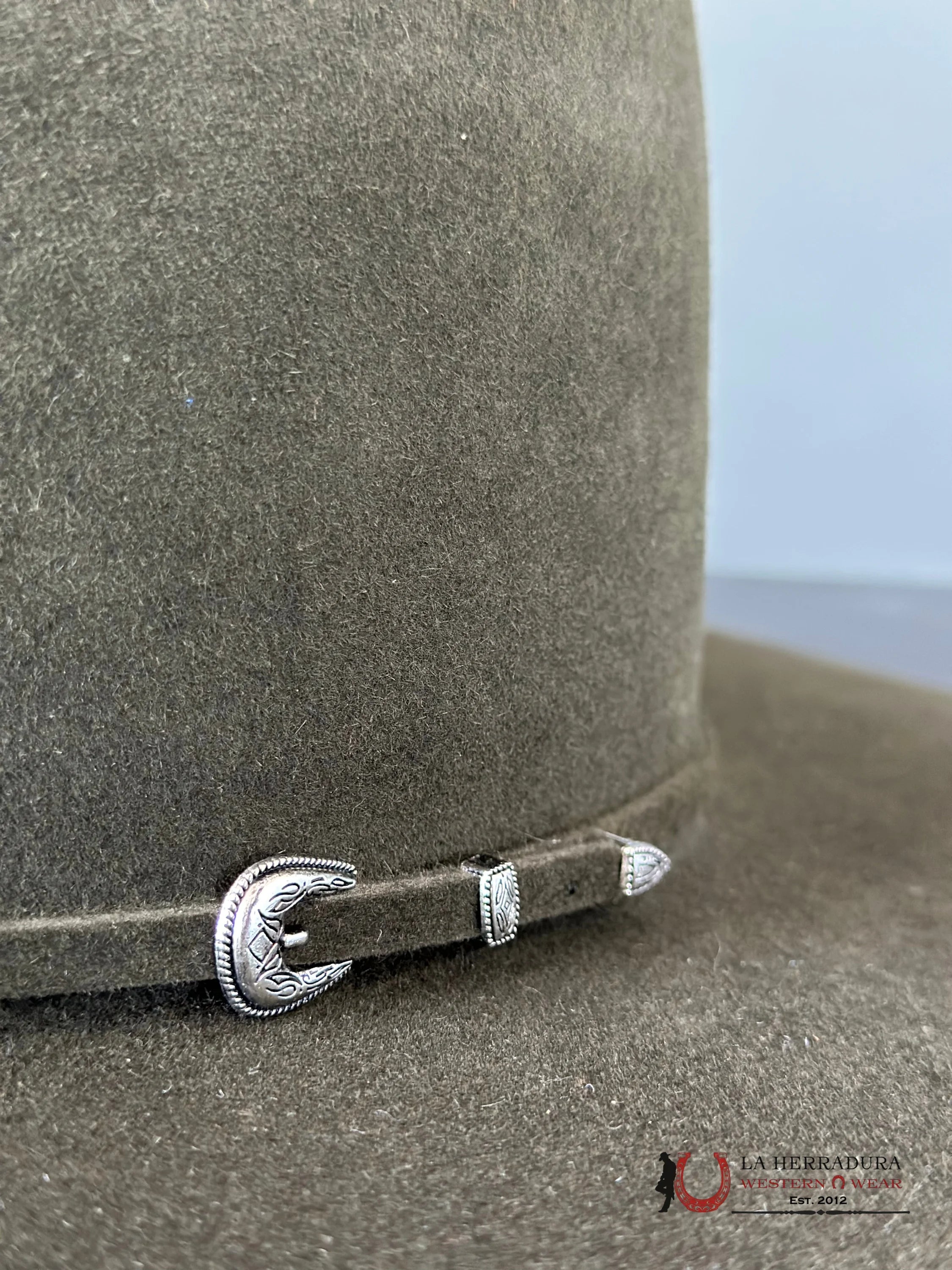 Introducing the Rodeo King 7X Moss Green Hat - featuring a Pelo de Conejo crown and brim for the perfect fit. The 5" crown and 4 1/4" brim are made with rabbit hair, and comes with an original Rodeo King box and a set of silver buckles. Look and feel your best with unbeatable style and comfort.