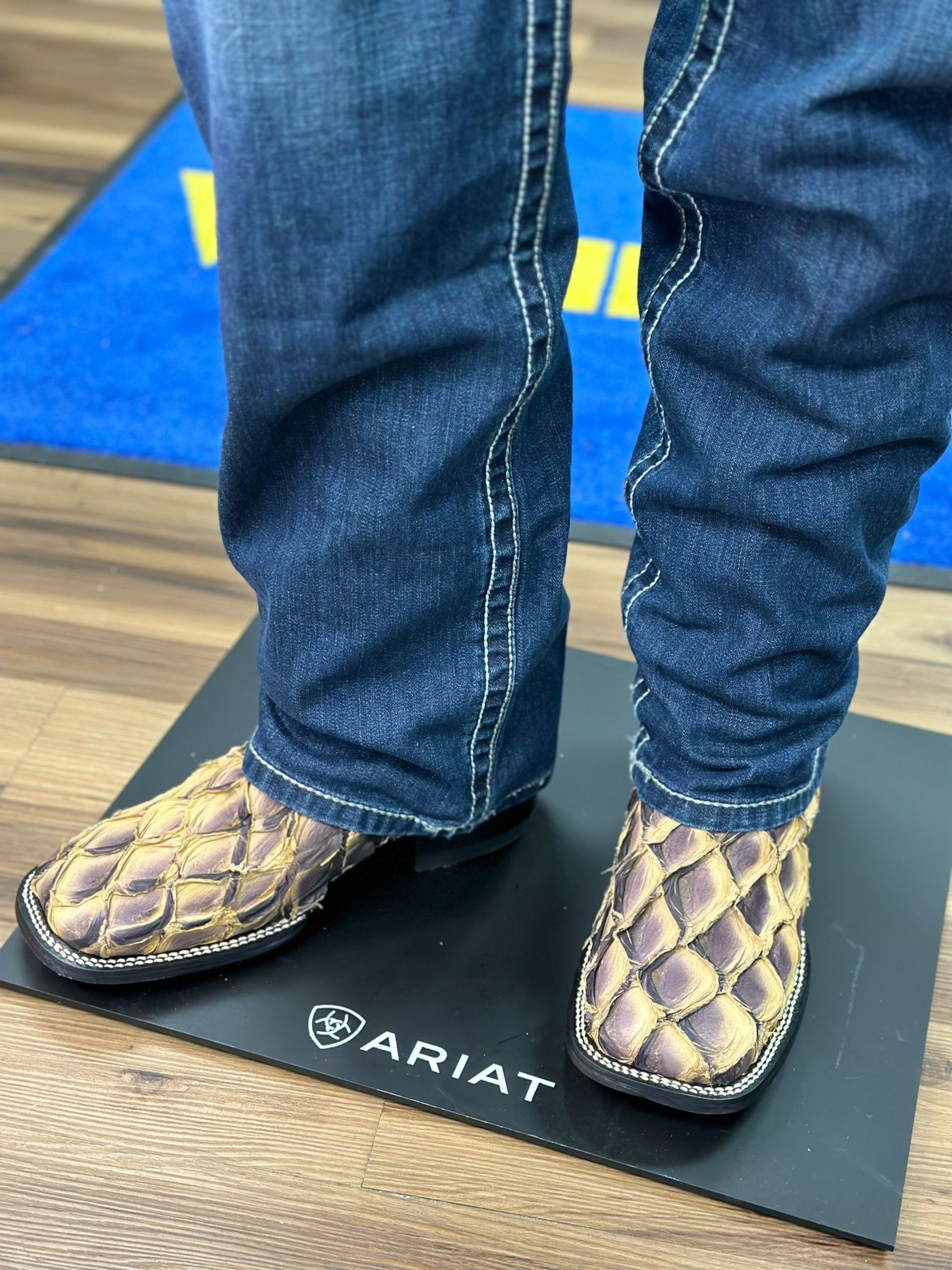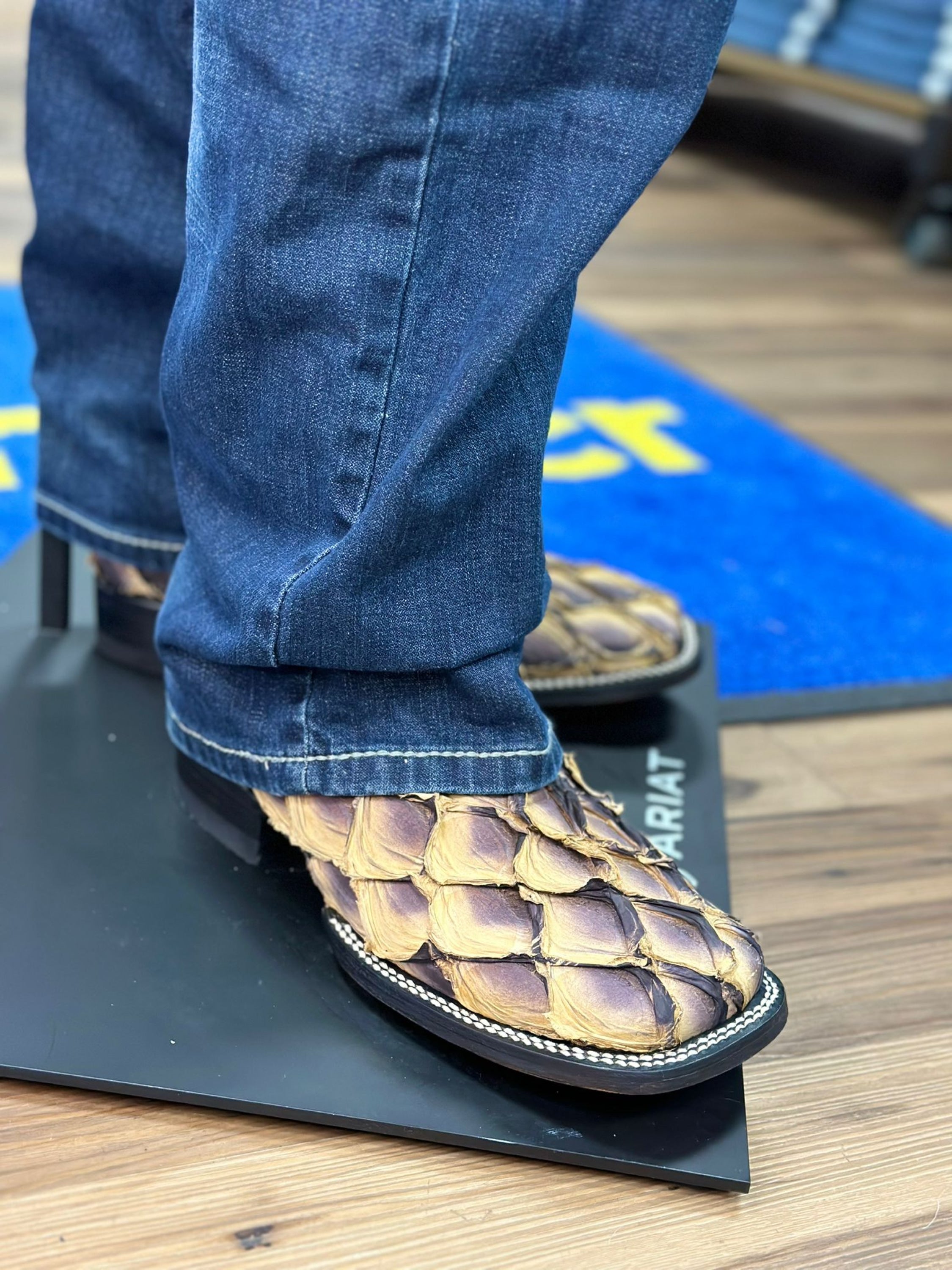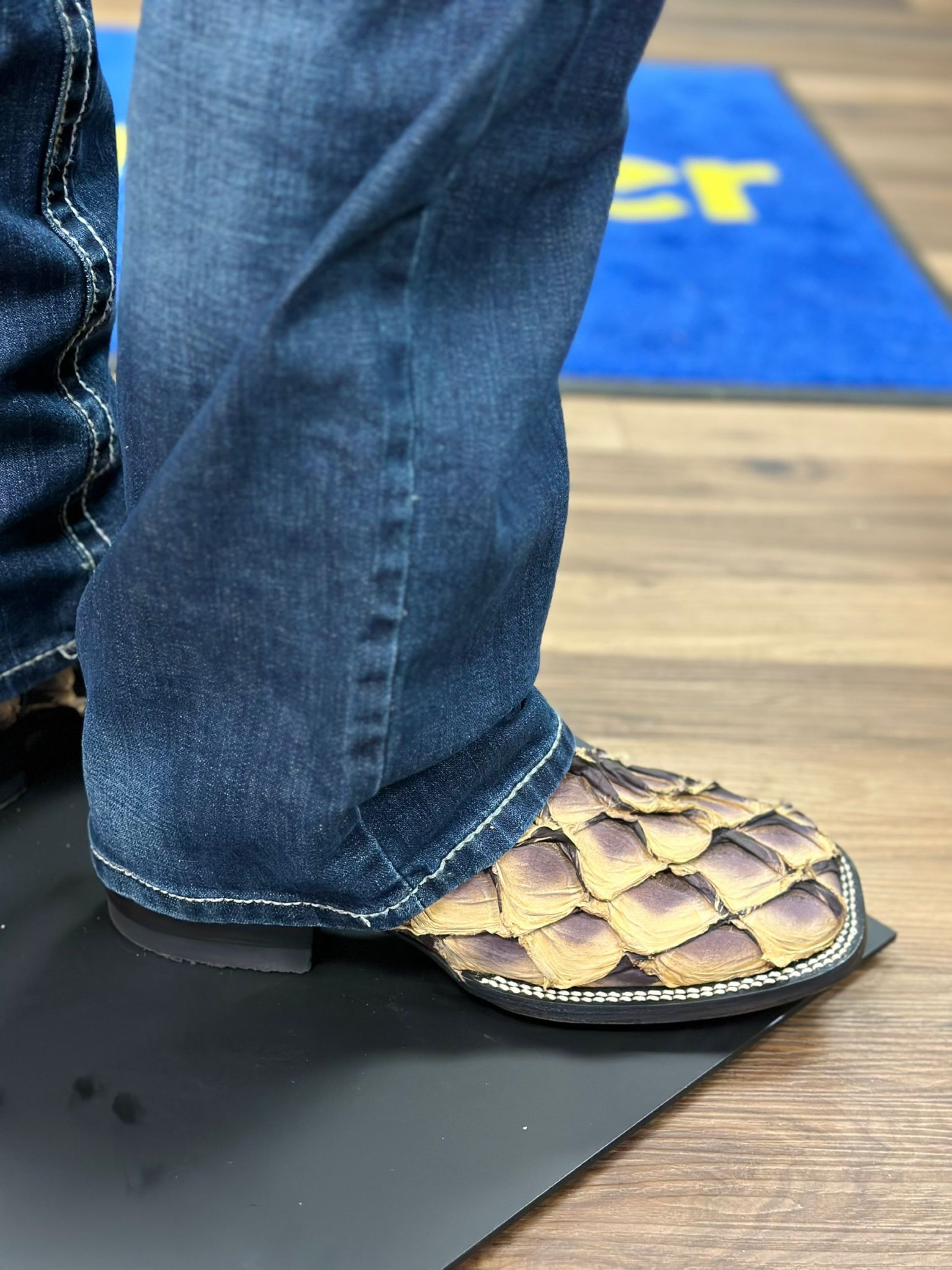 Step into luxury with THE STAGE COACH BOOT CO. SQUARE TOE EXOTIC BERGE TOOST FISH SKIN boots. These eye-catching square toe boots feature premium fish skin texture that turns heads while providing surprising comfort. The unique exotic material creates a statement piece that elevates any outfit from ordinary to extraordinary. Perfect for those who demand both elegance and comfort in their fashion choices.