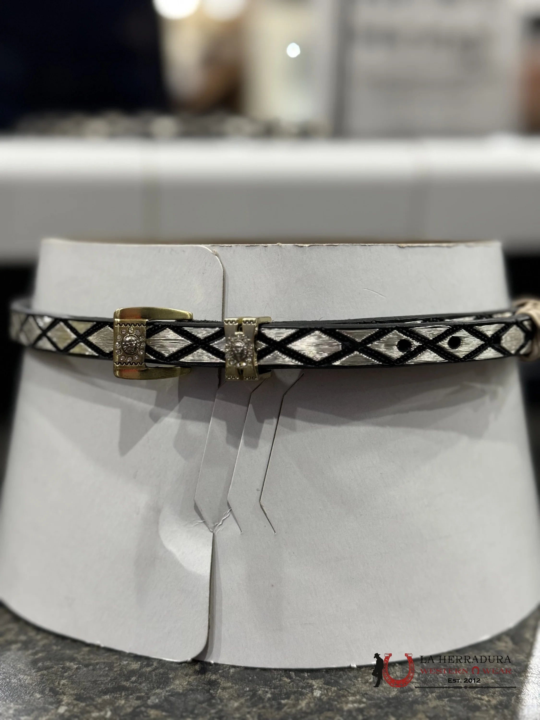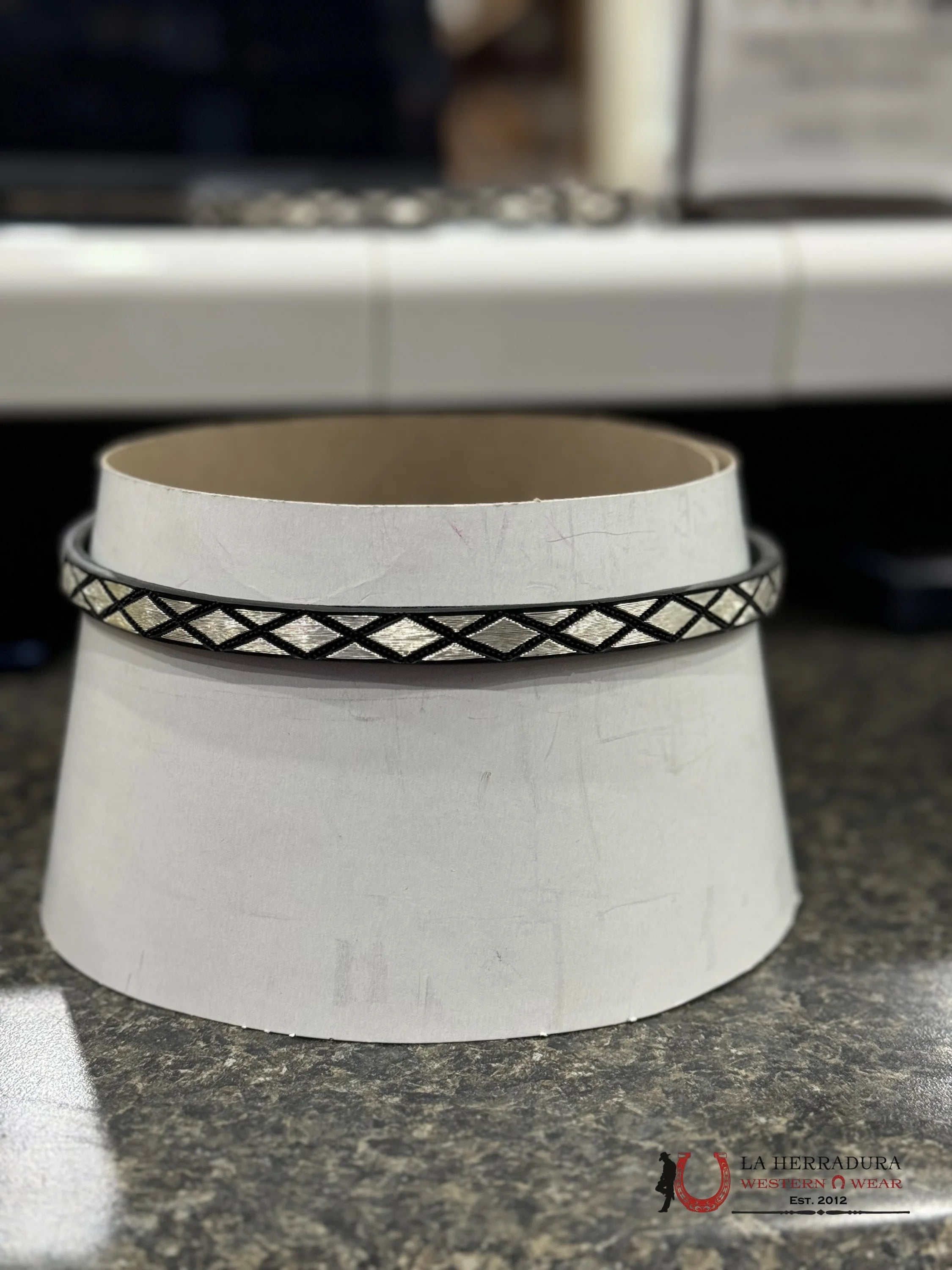 Handcrafted from genuine silver thread, this TOQUILLA DE PLATA ROMBOS is embroidered to perfection. Made to fit universally on both hats and sombreros, this one-of-a-kind piece adds a touch of elegance to any outfit. Elevate your style with this beautiful, handmade creation.