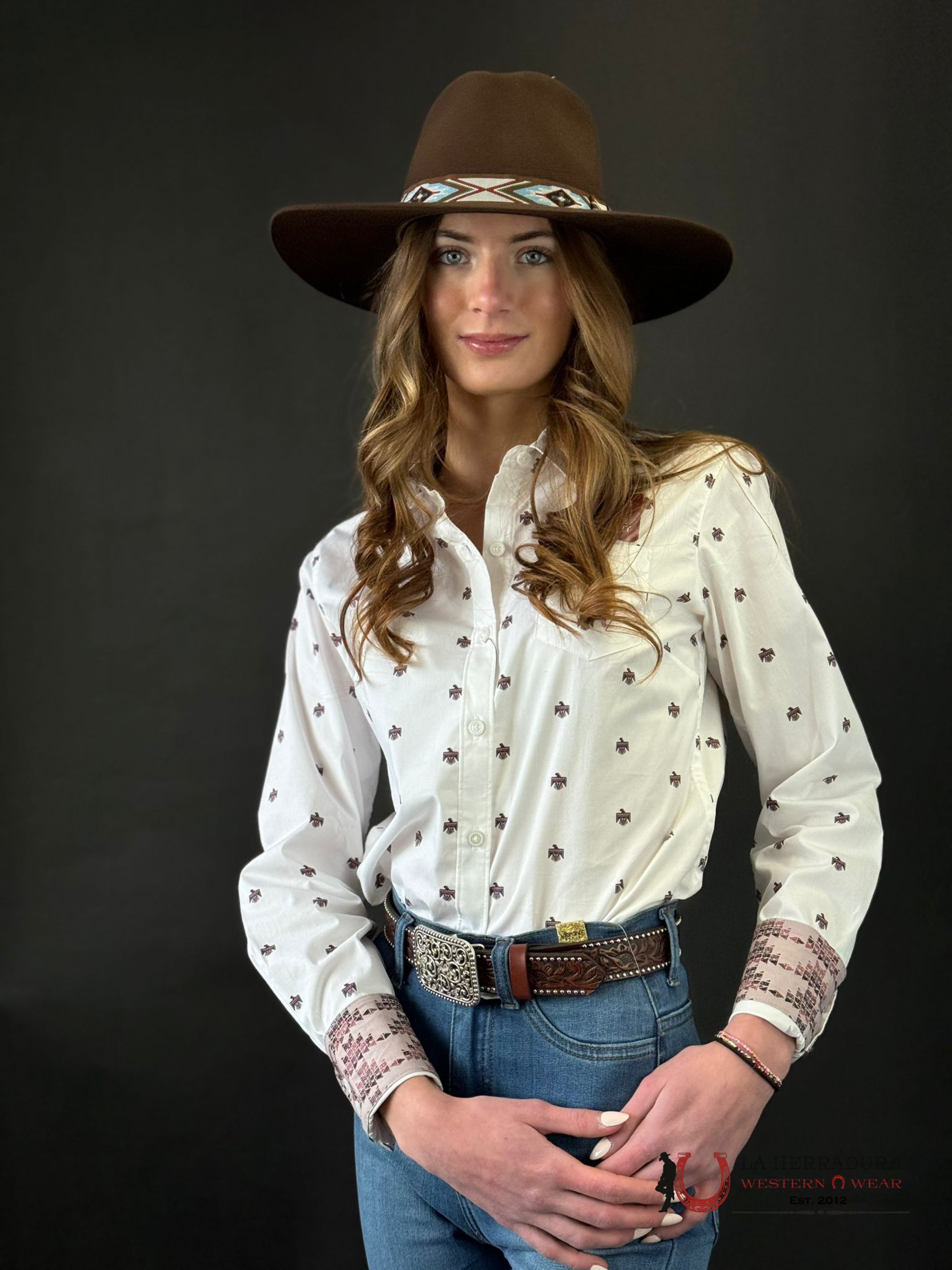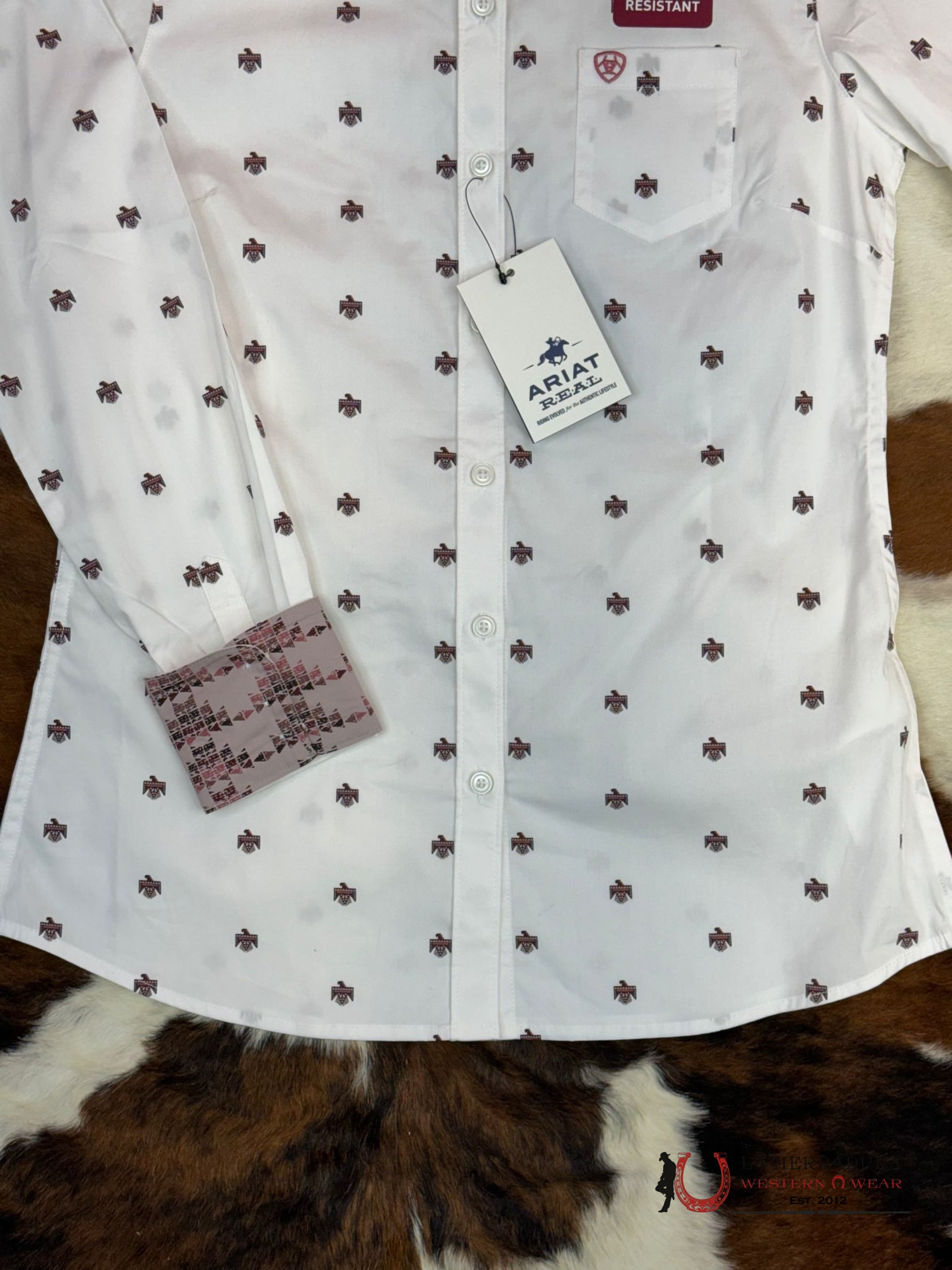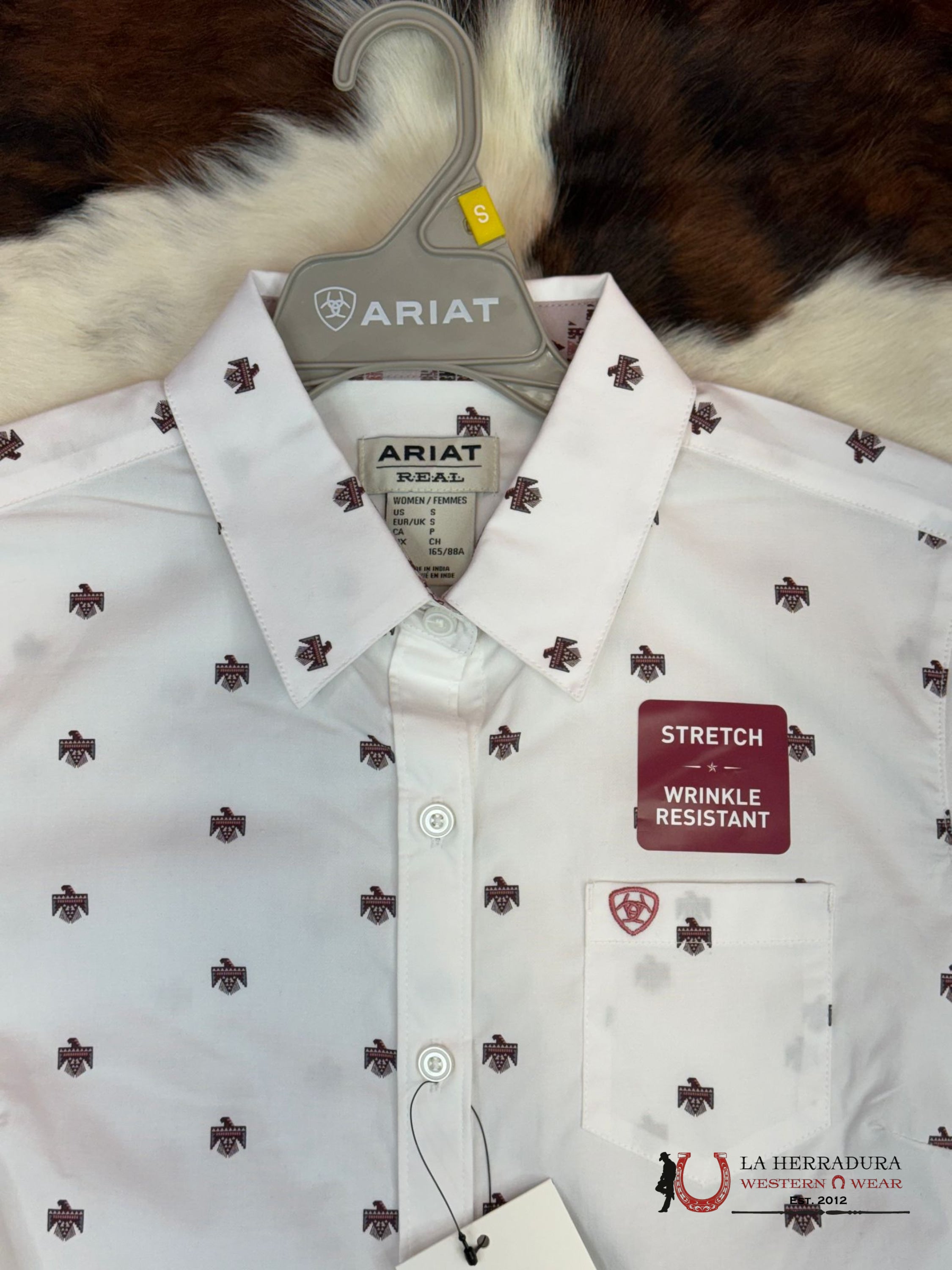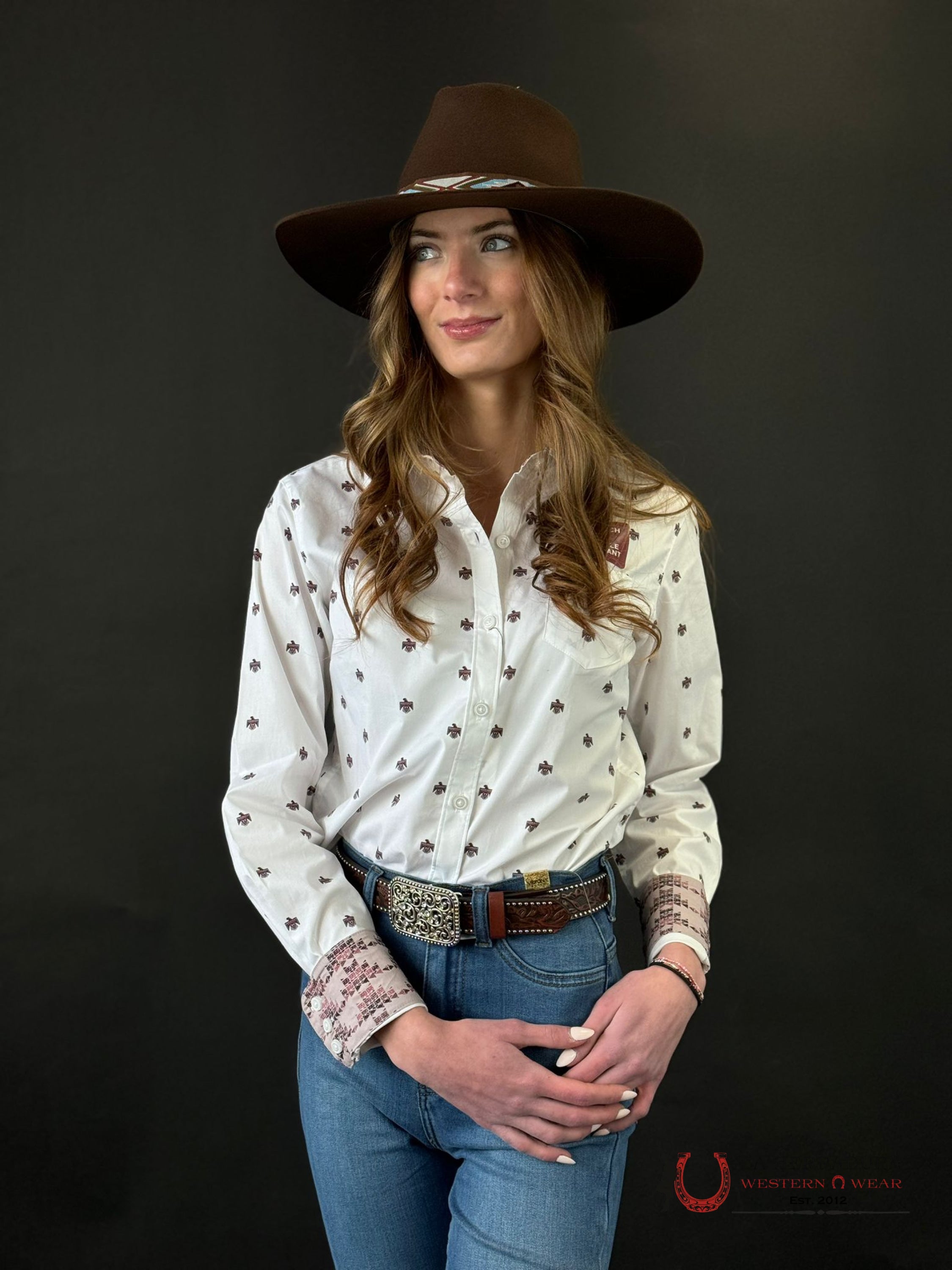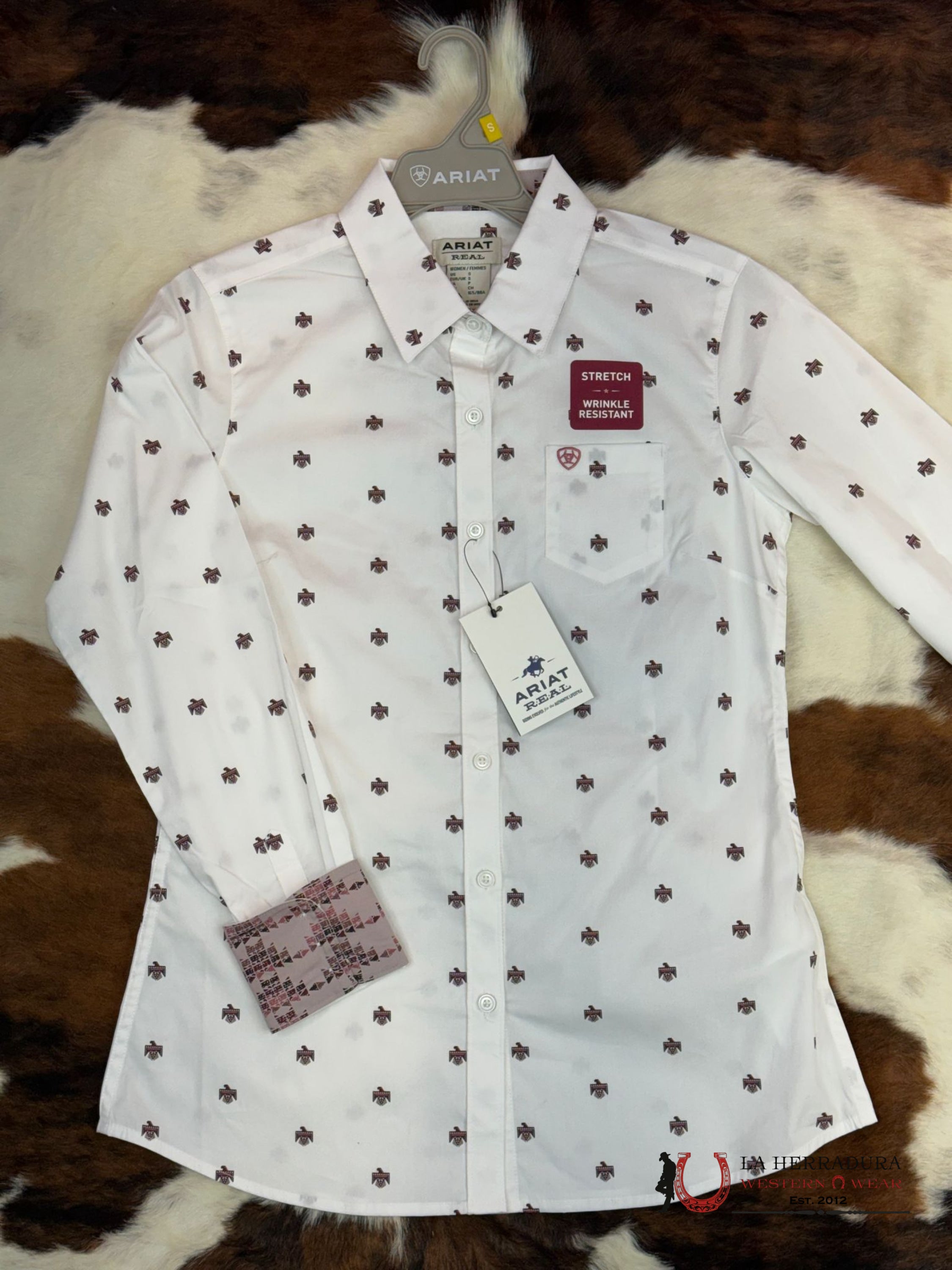 Unleash your inner cowgirl with the Women Ariat Kirby Long Sleeve! This stylish shirt features wrinkle-free stretch material for all-day comfort. Its fitted design and cute thunderbird print add a touch of western charm. Plus, the convenient front chest pocket is perfect for storing small essentials. Say goodbye to discomfort and hello to effortless style!