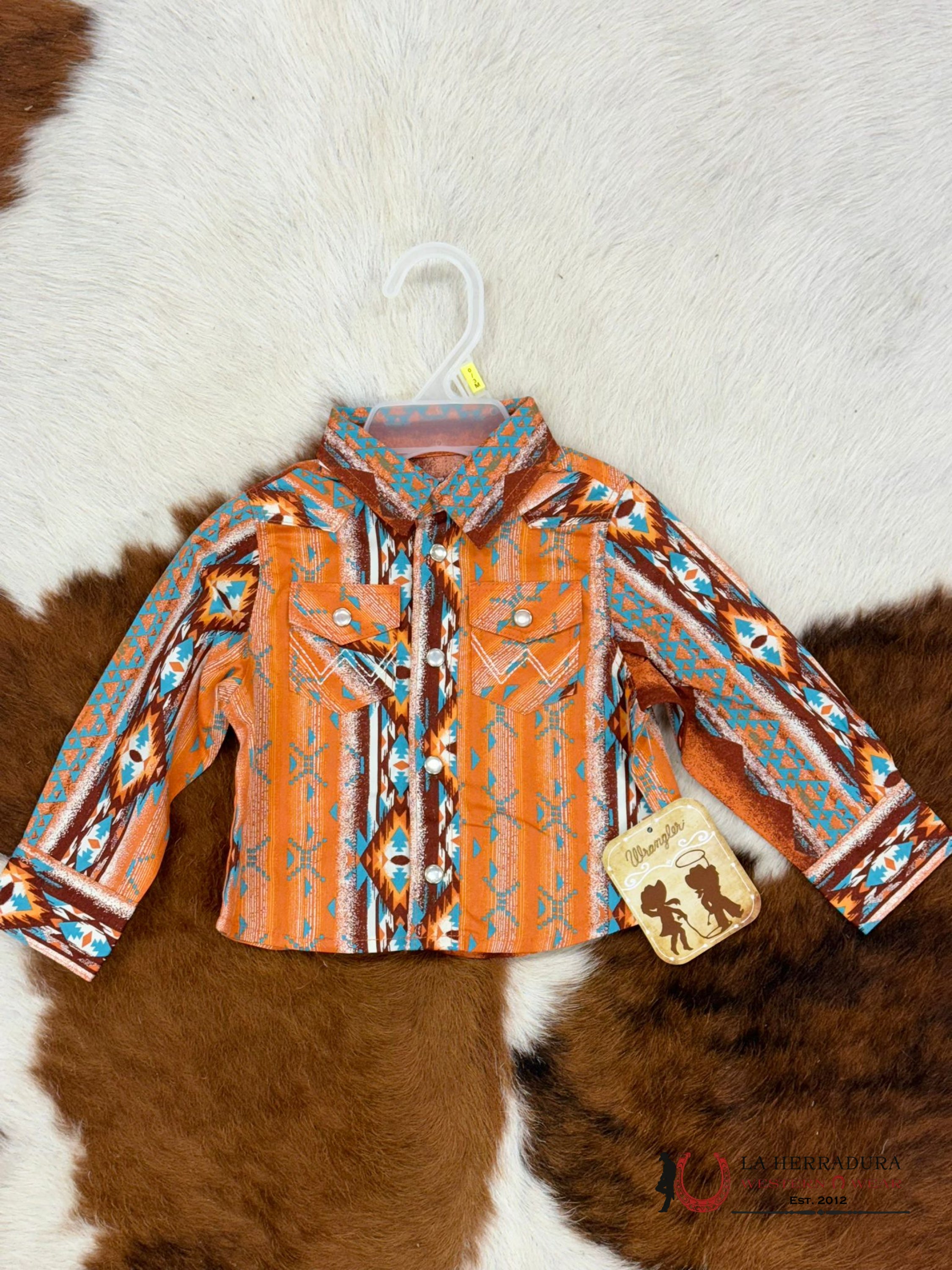 Dress to impress in this unique WRANGLER AZTEC ORANGE LONG SLEEVE BUTTON DOWN SHIRT! With its creative western-inspired styling and pearl snaps, this comfortable and stylish apparel will make your baby stand out from the crowd. Add a touch of individuality to their wardrobe today!